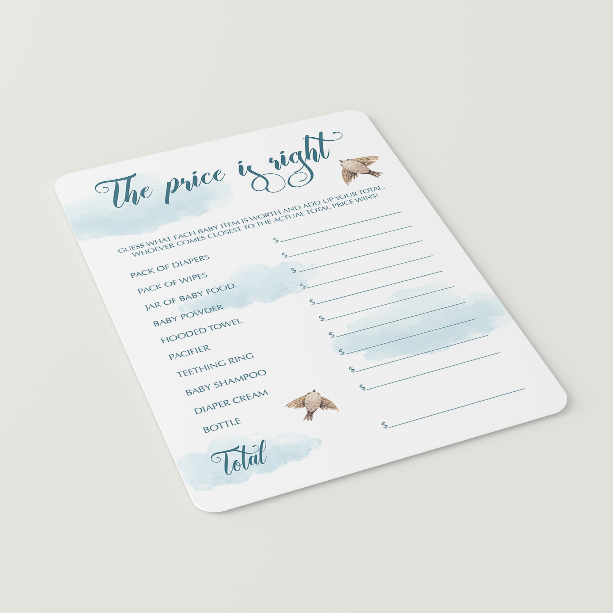 Play the Price is Right with these cute baby shower game cards with watercolor clouds. The unique cards would be perfect for a boy baby shower or hot air balloon themed baby shower and will create an enjoyable moment for all of your guests.