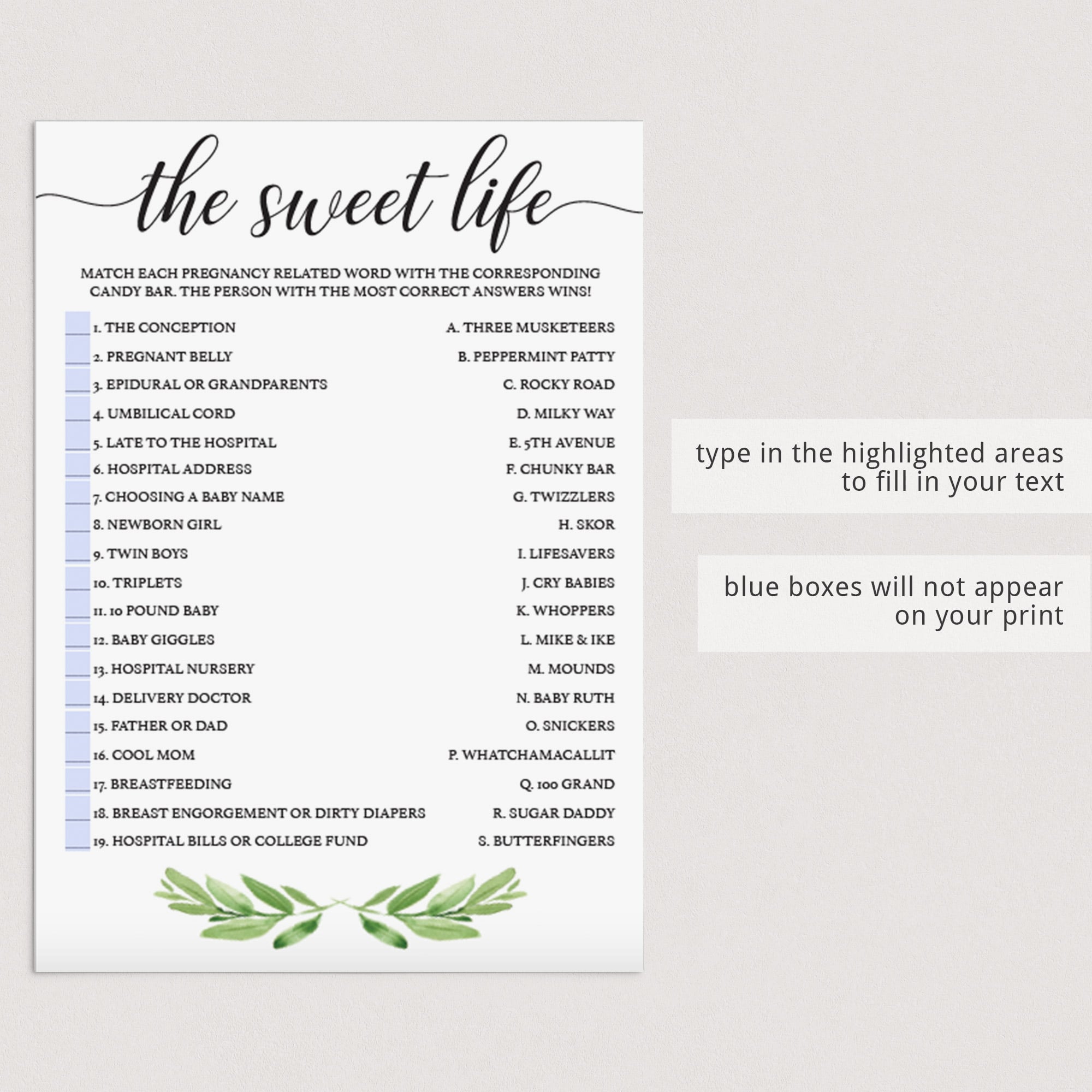 The Sweet Life is a great way to entertain your (virtual) baby shower guests and get everyone involved. Your guests will have to match popular candy bar names with pregnancy-related things. Printable and electronically fillable files are included.