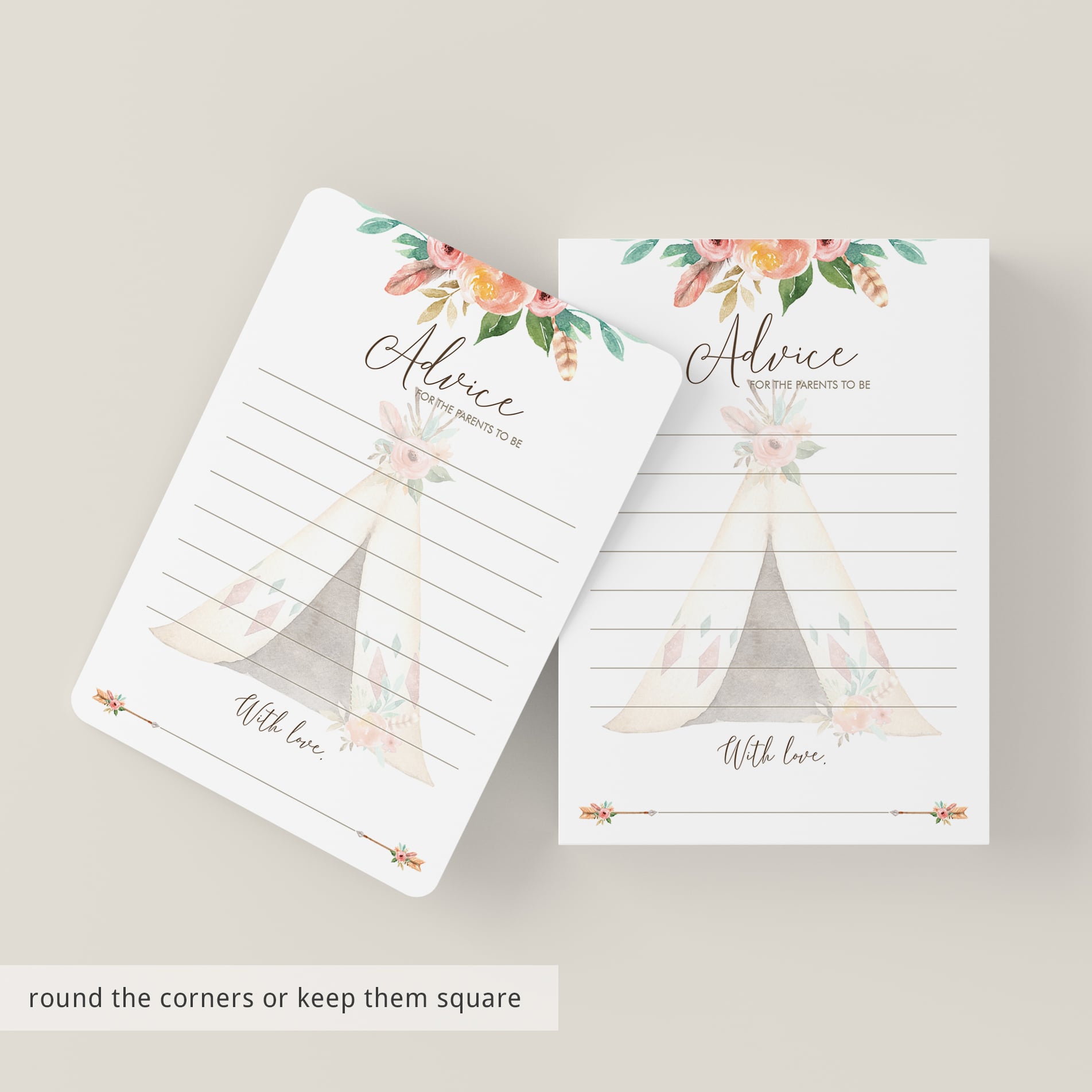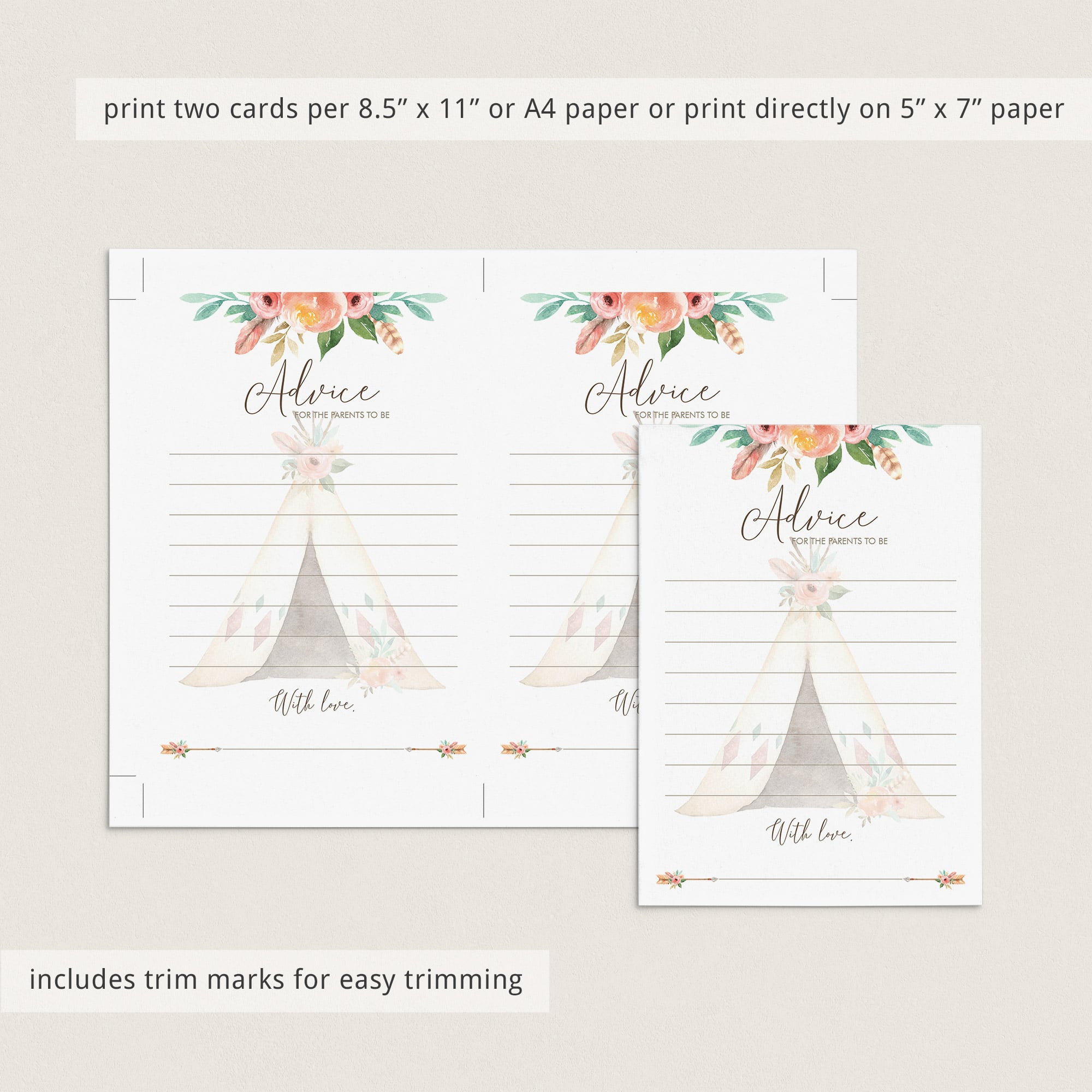 Create a meaningful keepsake for the new parents with these tribal baby shower advice cards with watercolor flowers and teepee. Let every guest write down their words of wisdom and collect the cards for the lucky couple. They are perfect for a boho themed baby shower party.
