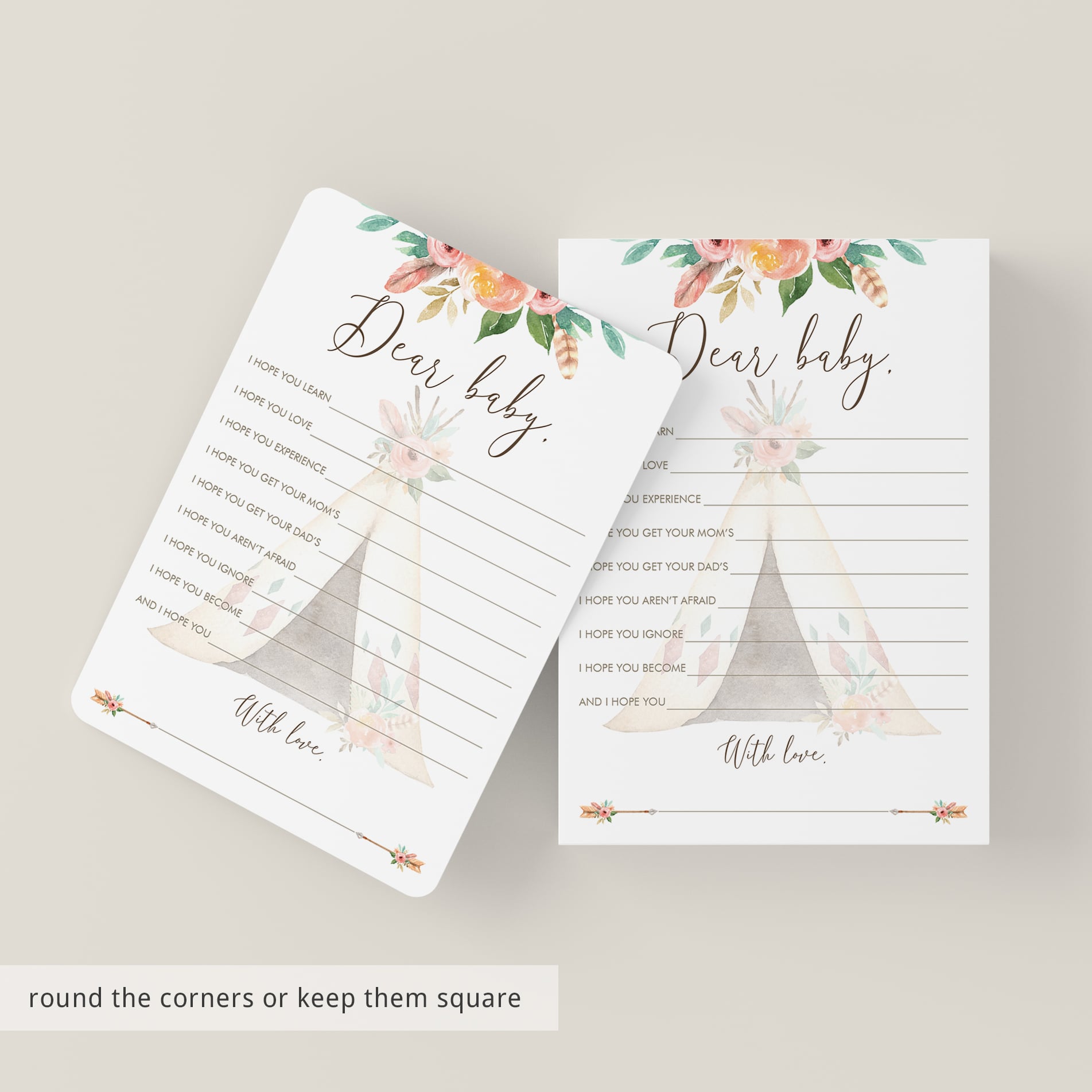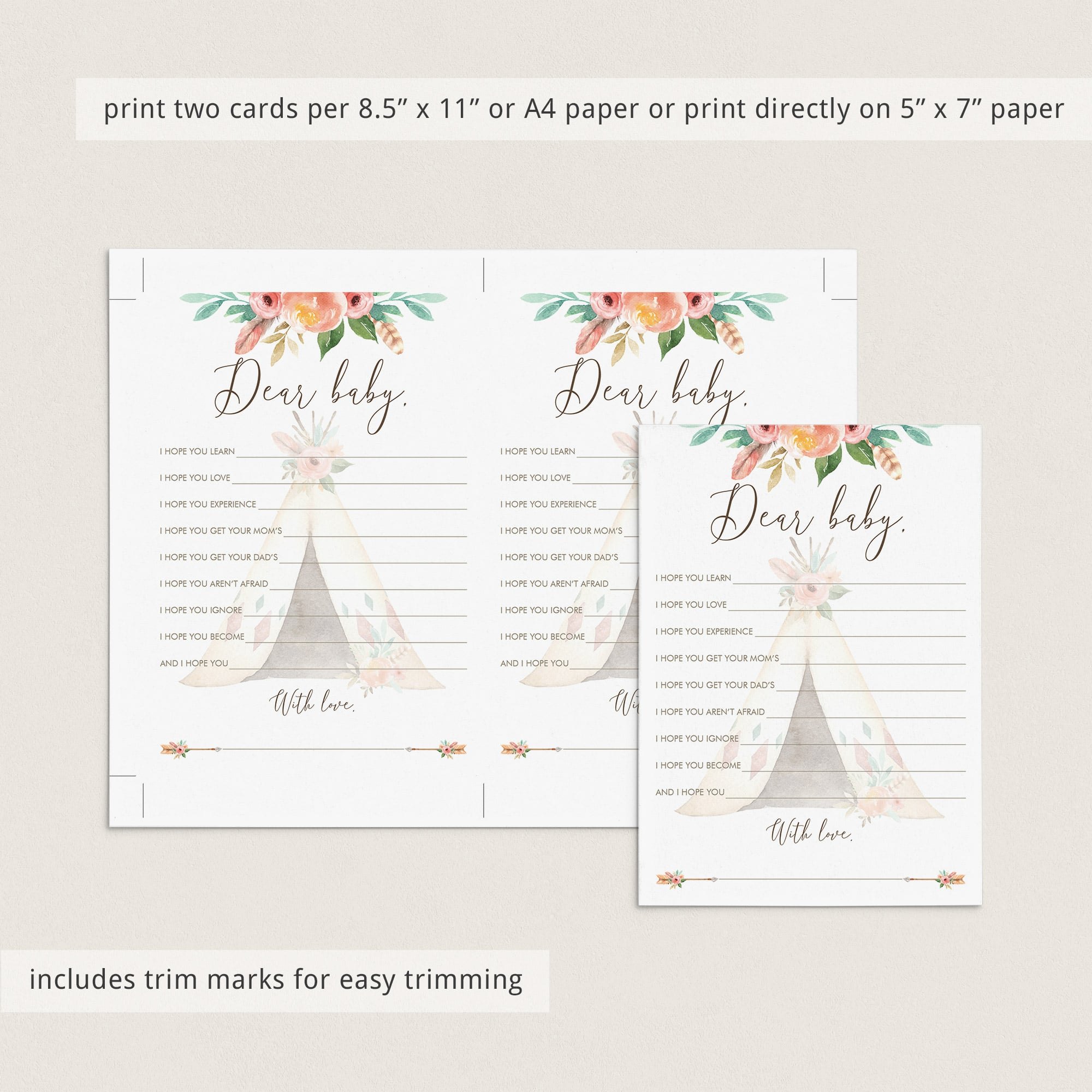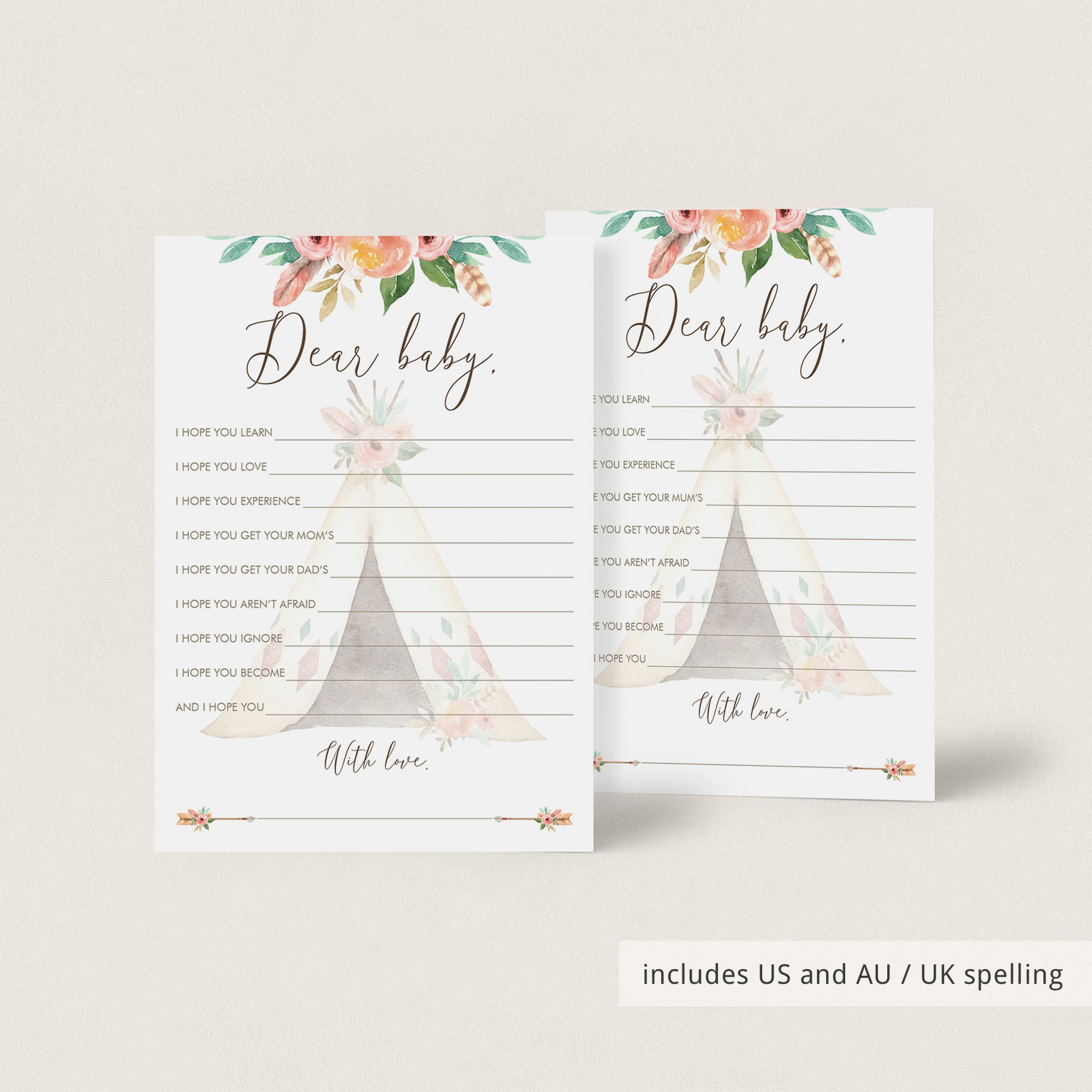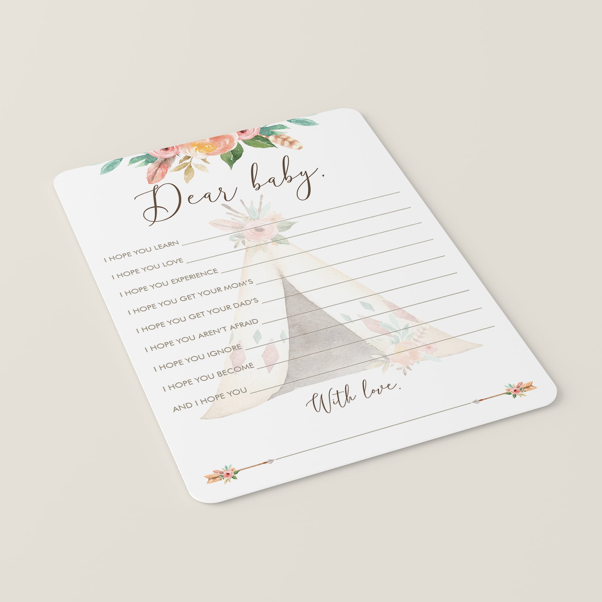 Create a magnificent keepsake for the mom-to-be with this tribal baby shower Wishes for Baby card. Let every baby shower guest write down their wishes for the little one and collect the cards with watercolor flowers and teepee for the lucky mom-to-be. The cards are perfect for a boho themed shower.