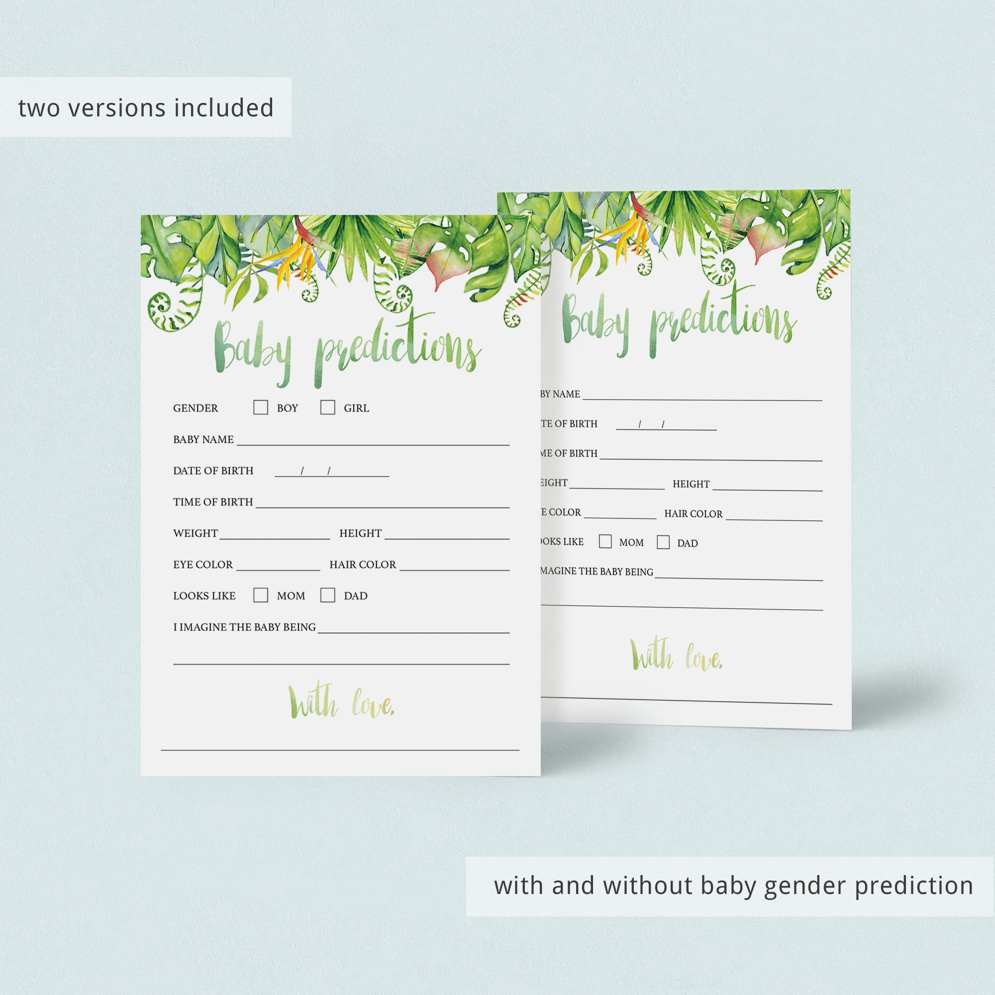• Baby Predictions card (two versions included, with and without baby gender prediction).