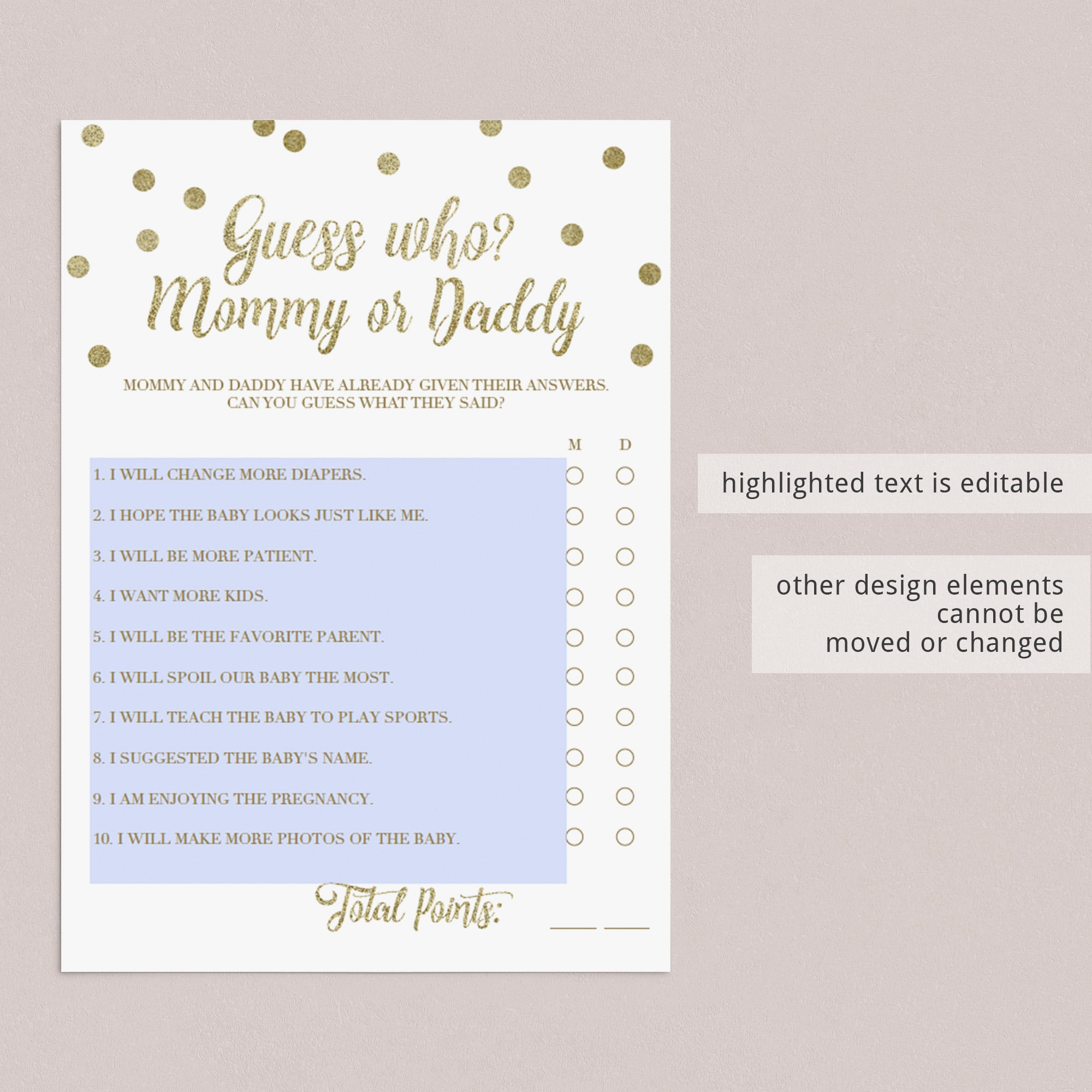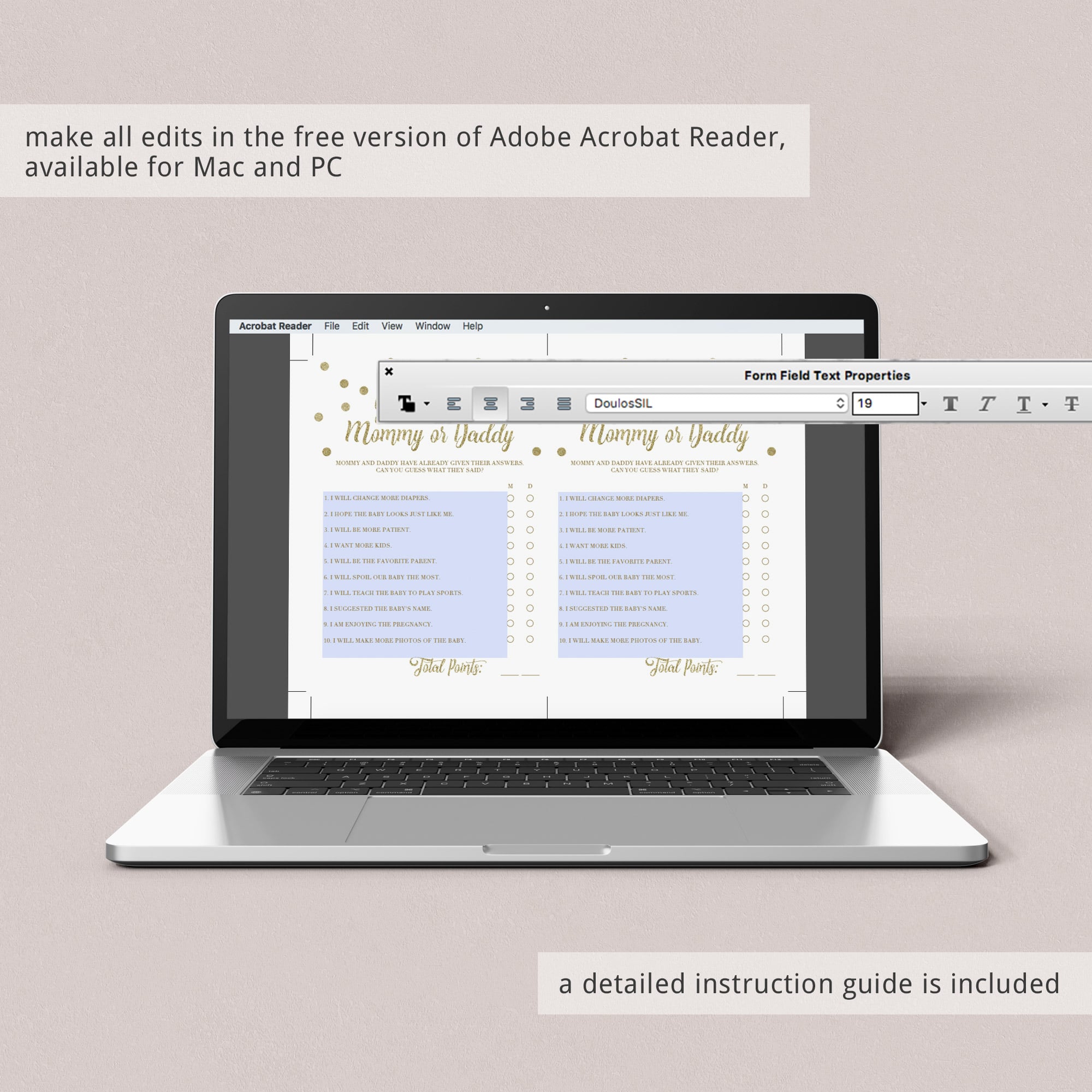 The game Guess Who Mommy or Daddy is editable in the free version of Adobe Acrobat Reader, so that you can personalize the game (please check the photos to see what parts can be edited).