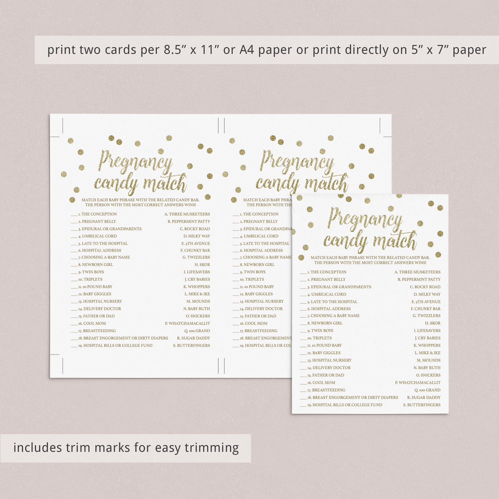 This unique baby shower game with gold confetti has a list of 19 candies and baby-related words that go along with each candy. For example, “baby giggles” is a match with the “Snickers” candy.
