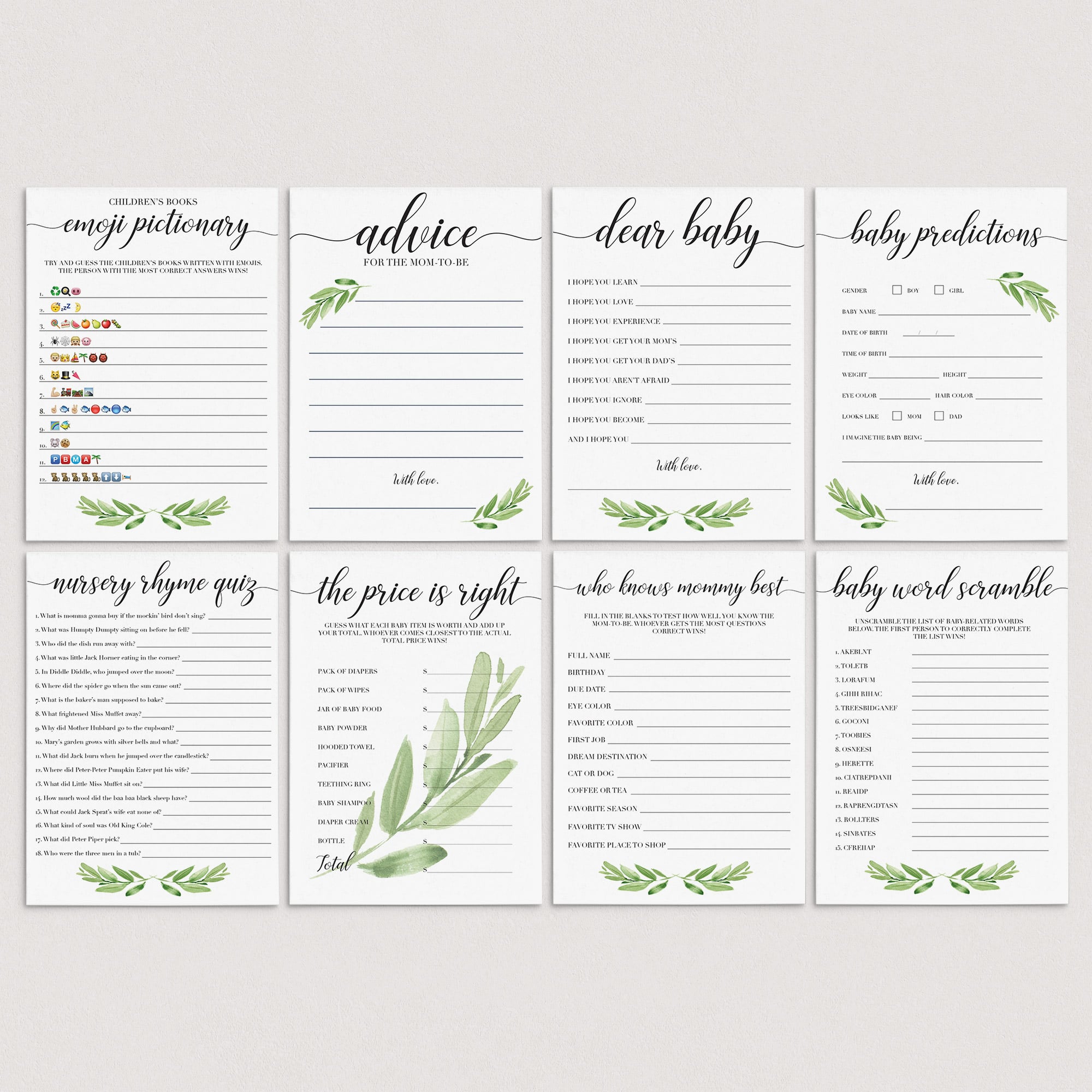 This baby shower game bundle includes the following 8 virtual baby shower games: