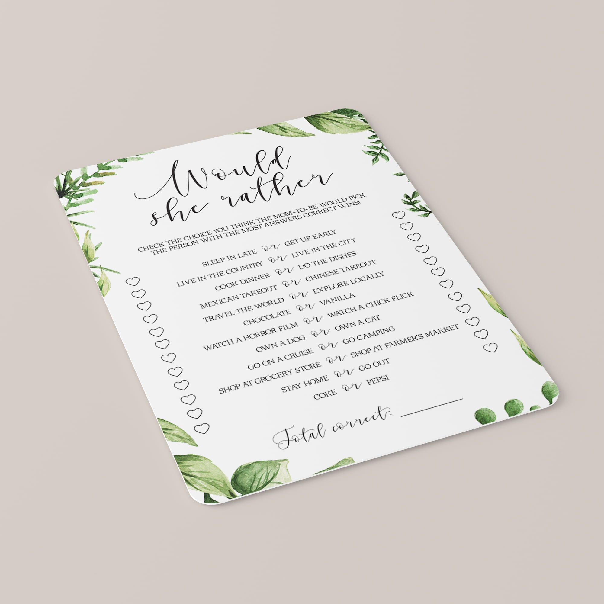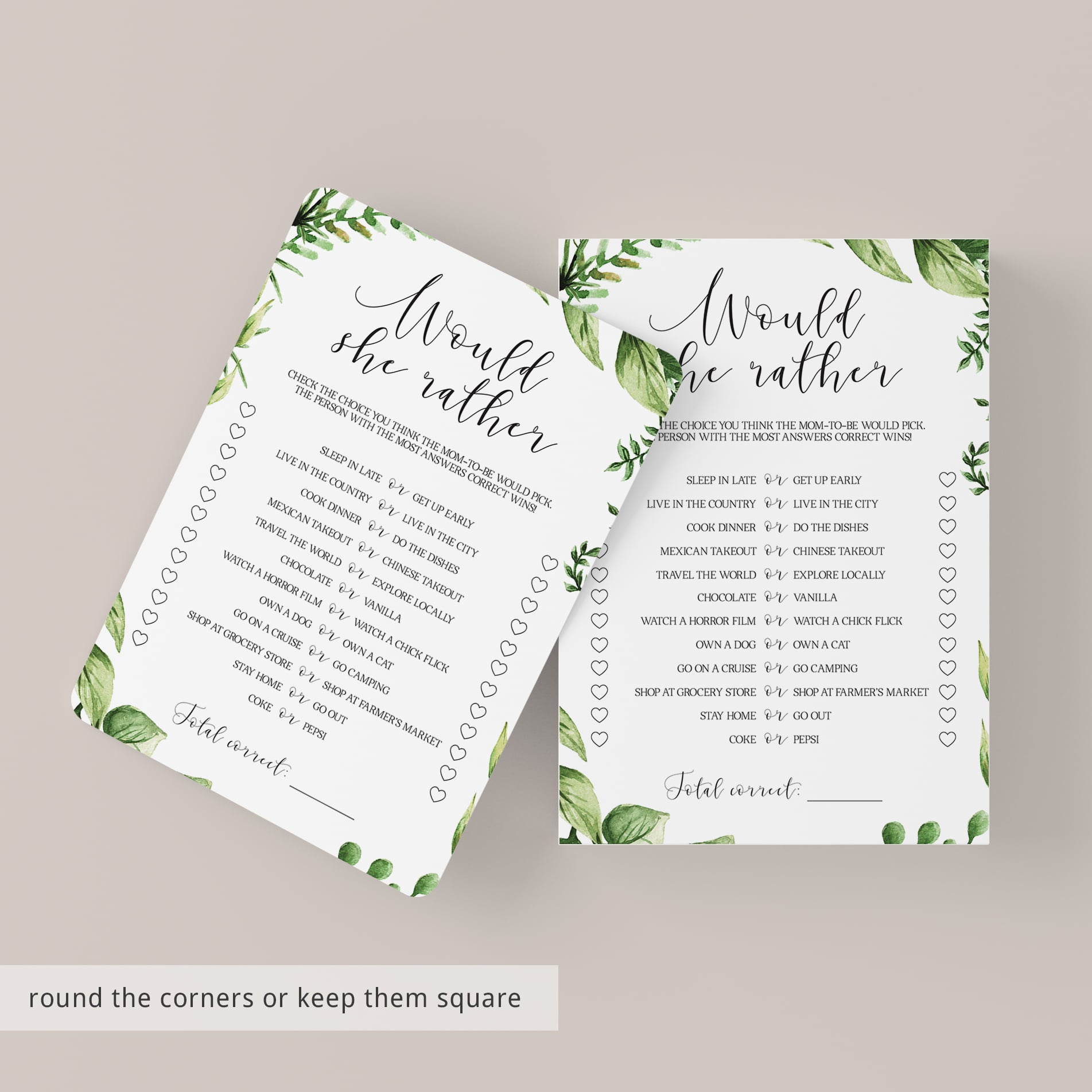 Are you looking for the perfect ice breaker to get people talking and in the party mood for your baby shower? Play “Would She Rather”! After all, your guests have one thing in common: you know the mom-to-be. This botanical game with watercolor leaves would be perfect for a green themed baby shower.