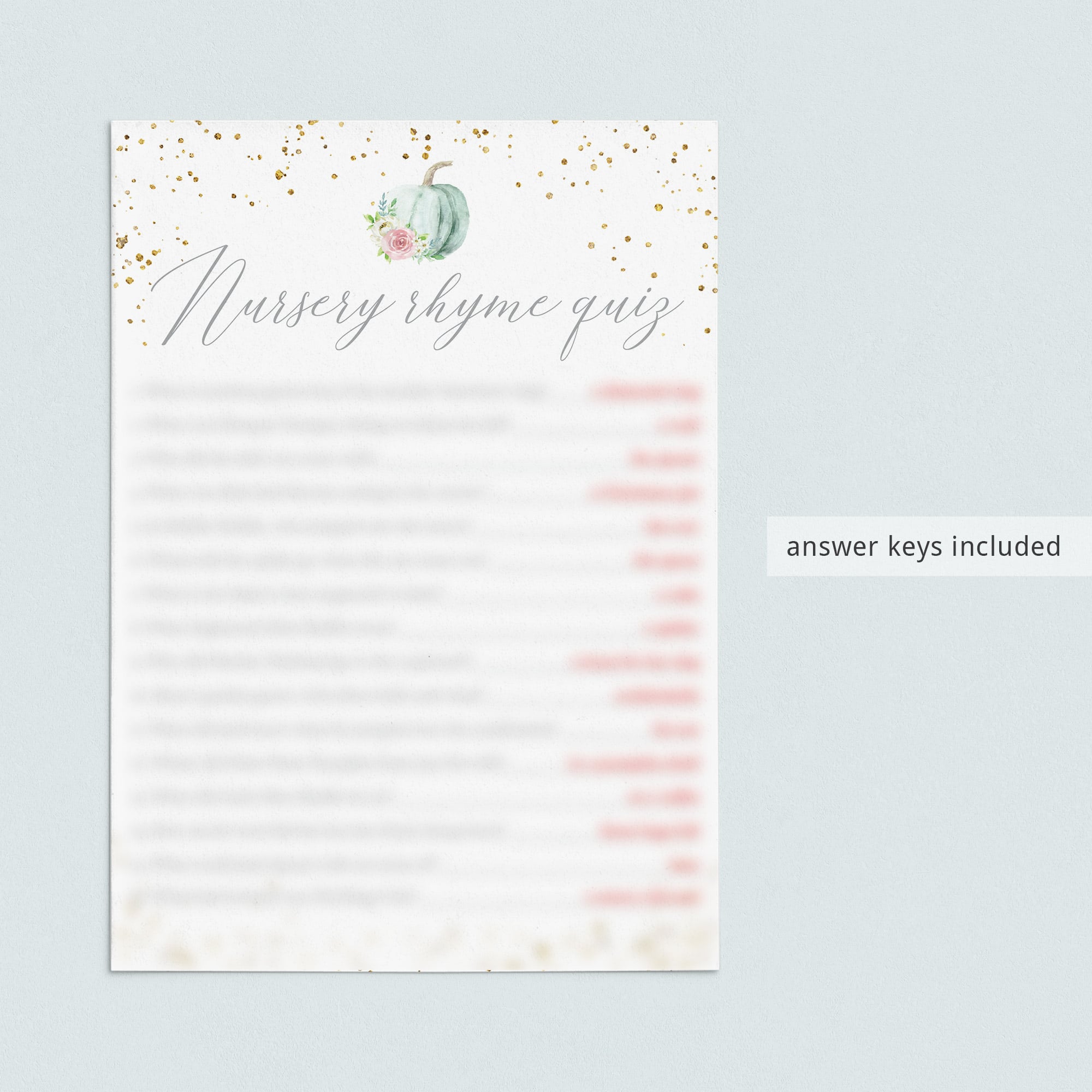 Are you hosting a baby shower in fall? Entertain your guests with this gorgeous watercolor pumpkin baby shower games bundle. The pastel color scheme with shades of green and pink in combination with the gold confetti will get everyone excited. The bundle includes everything you need to entertain large groups of guests with a variety of activities.