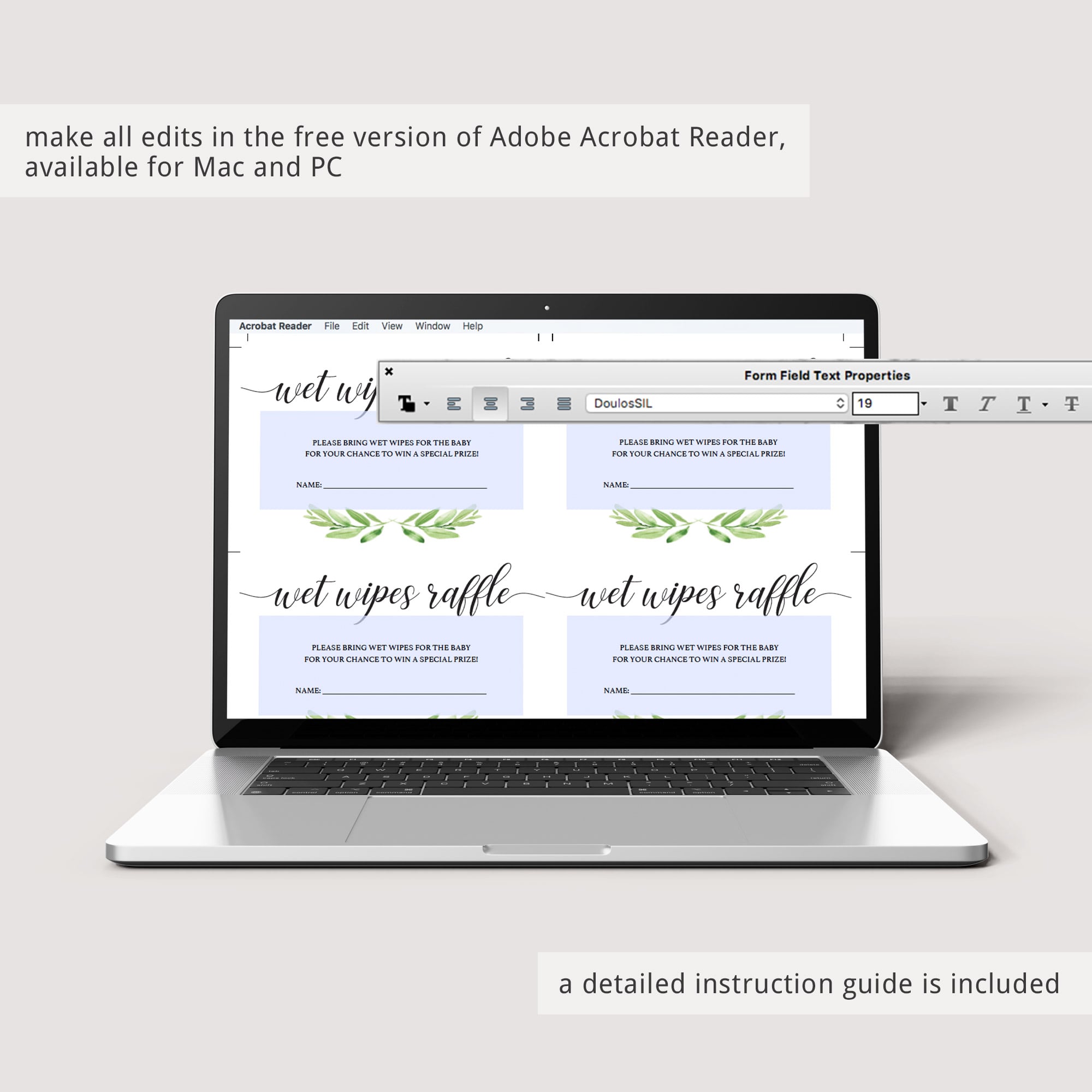 Easily personalize the wipes raffle ticket with your own words and print the cards on plain white paper. We recommend a nice heavy card stock for highest quality feel. A detailed instruction guide with tips & tricks on editing, trimming, paper choices and more is included.