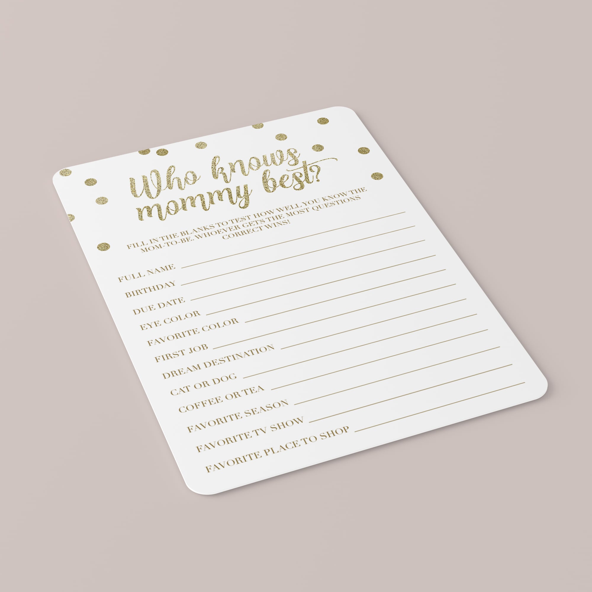 Test your guests how good they know the mommy-to-be and play ‘Who knows mommy best’ with these gold (virtual) baby shower game cards. This mommy quiz is a great way to bring disparate people together and to put them all in a party mood. Printable and electronically fillable files are included.