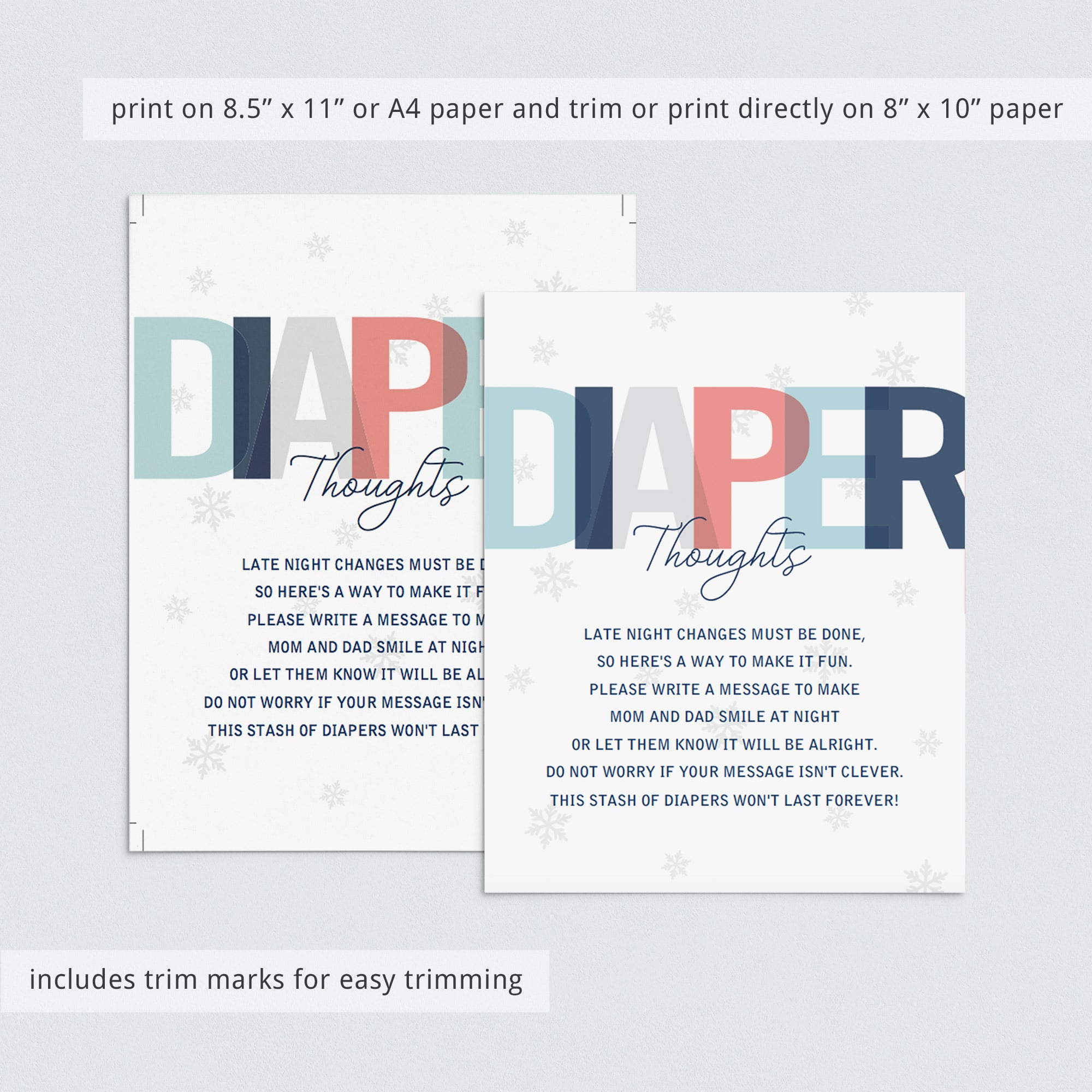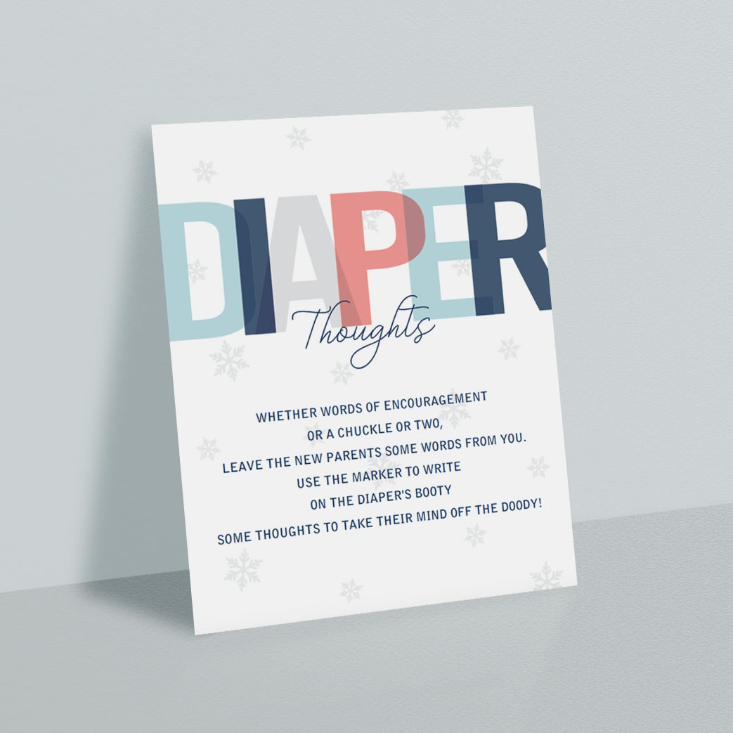 Are you looking for a creative and fun activity for your winter themed baby shower? Set up a Diaper Thoughts station with this winter baby shower Diaper Thoughts sign with subtle snowflakes. Guaranteed to be a huge hit!