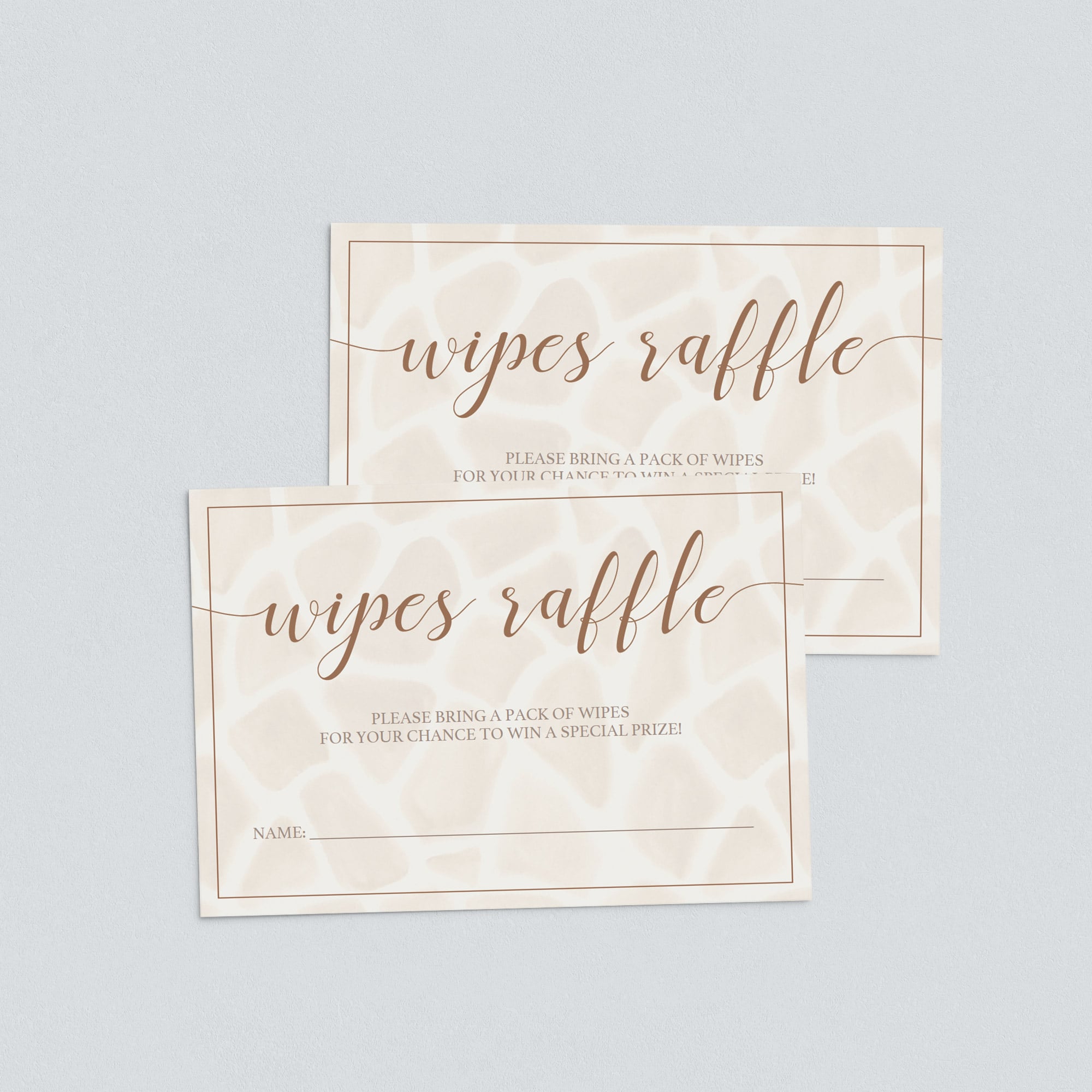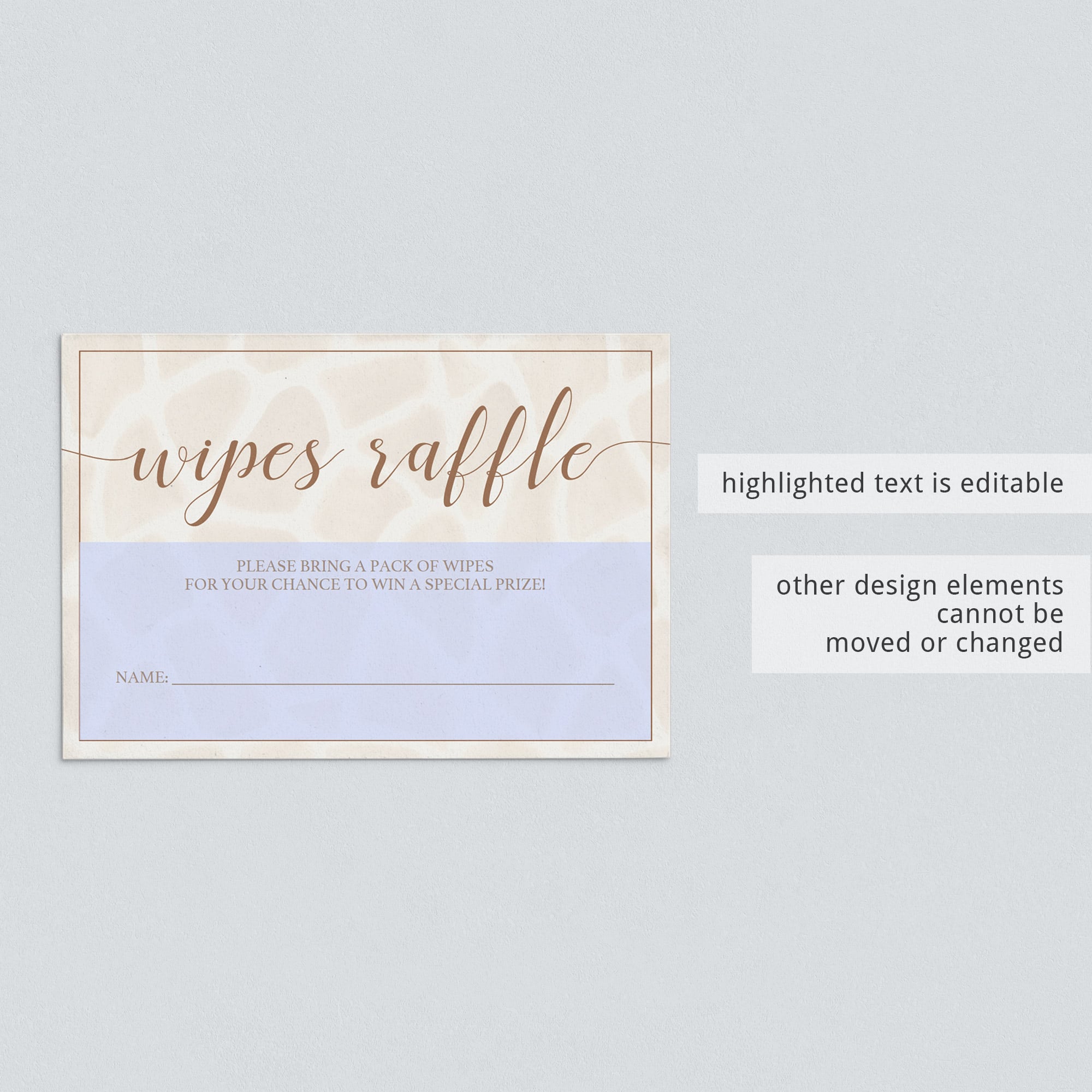Who doesn't love a raffle during a baby shower? Use this baby shower wipes raffle ticket to let your guests know they can win a great prize by bringing a pack of baby wipes. Include the gender neutral wipes raffle ticket in your baby shower invitations before sending them out.