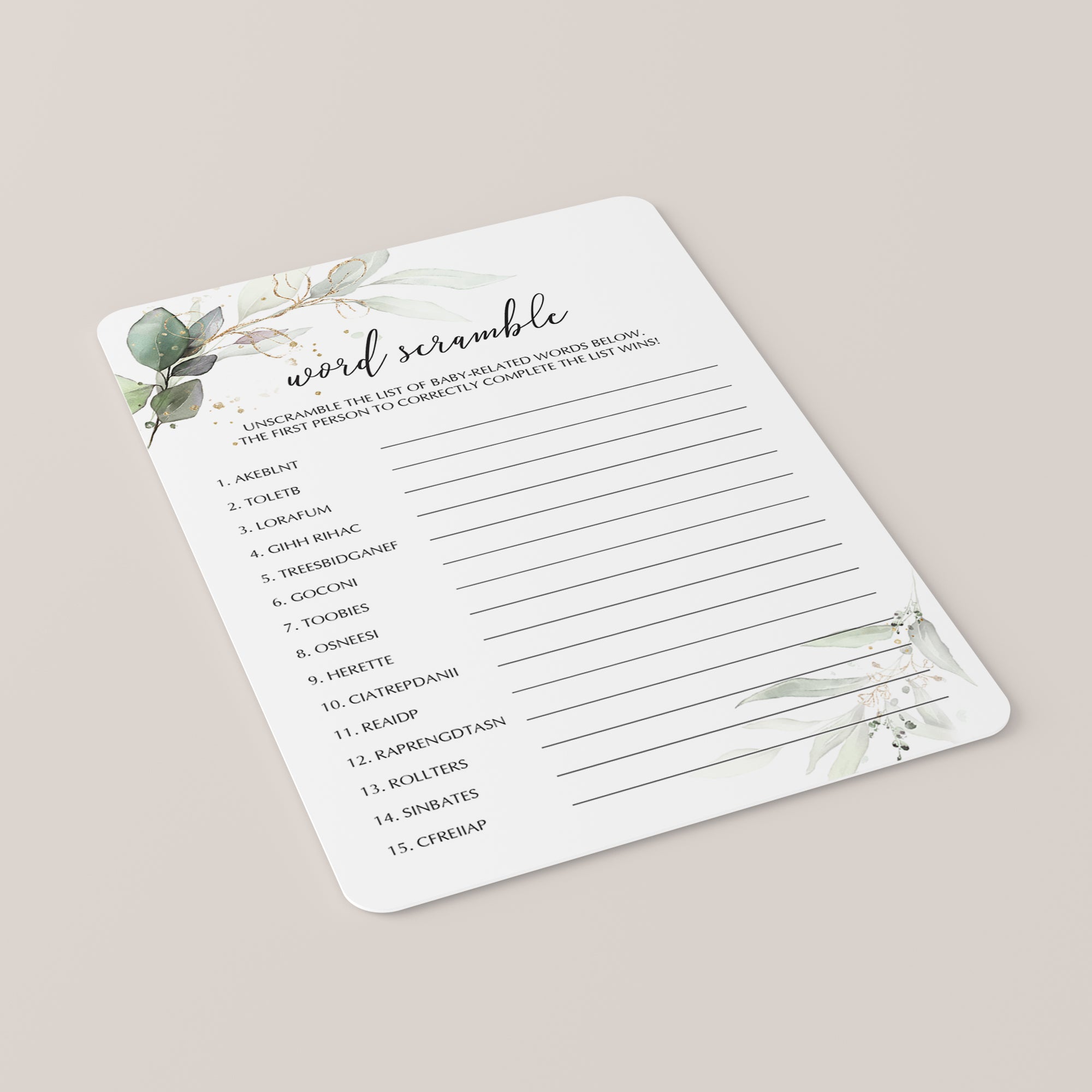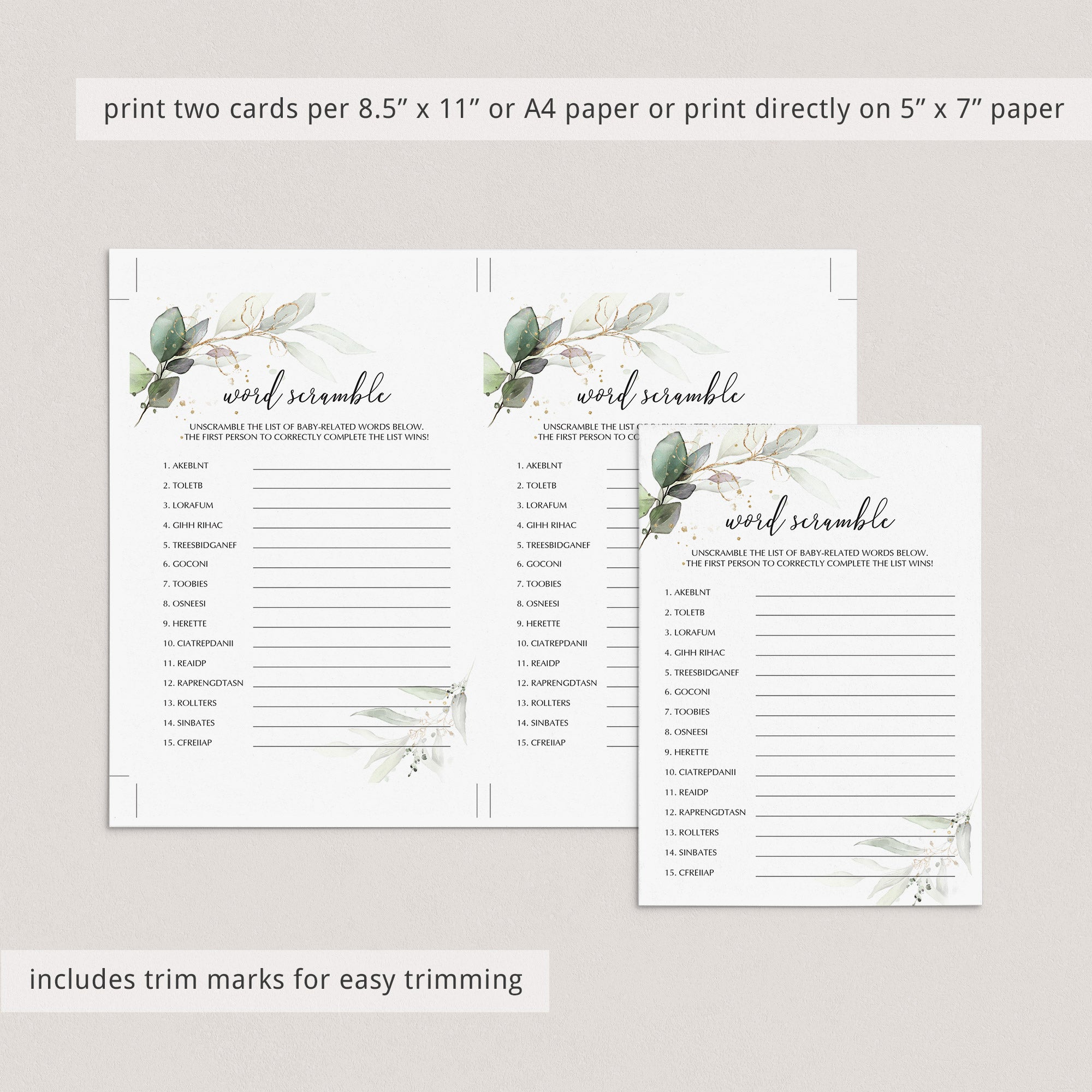 Play Baby Word Scramble and WOW everyone with your green and gold baby shower game cards!