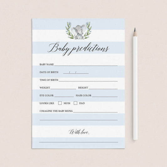 Are you hosting an elephant themed baby shower to celebrate the arrival of a baby boy? Create a magnificent keepsake for the mom-to-be with this adorable blue elephant baby predictions card. It's a fun way to engage your guests during the party and it makes...- $4.49