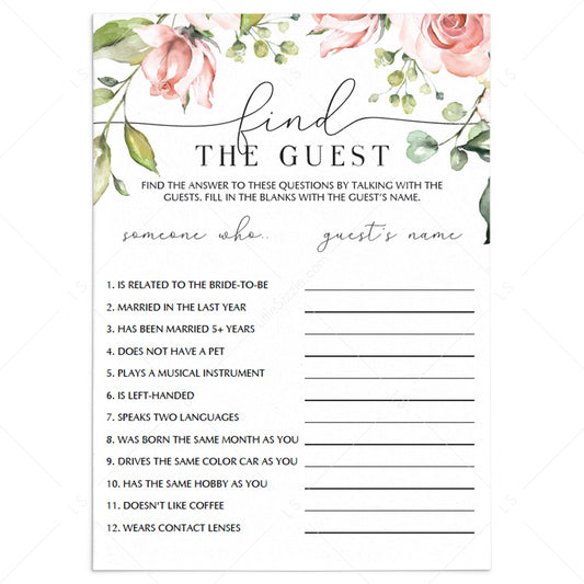 Ensure that your guests mingle with this fun Find the Guest game for wedding showers. It's the perfect way to break the ice! Add your own information and let your guests find the person that matches the description. The game cards with blush flowers...- $4.49