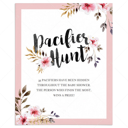 Pacifier Hunt is a fun baby shower game that gets everyone out of their seat. Before the baby shower hide a number of pacifiers around the party. Display this blush floral pacifier hunt game sign with watercolor flowers towards the entrance of your baby shower letting...- $4.49