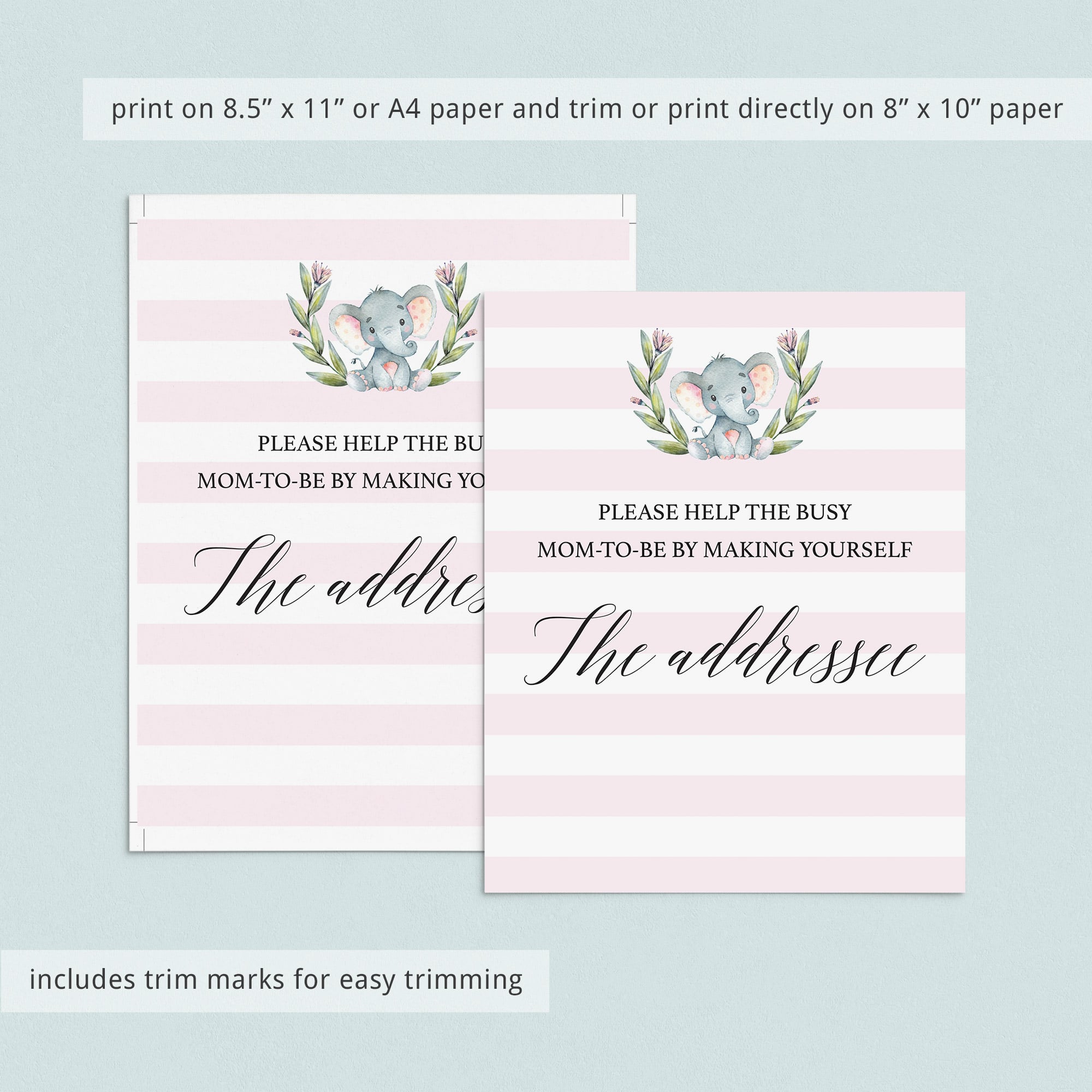 Make life easier for the mom-to-be by setting up an Address Card Station. Use this pink and white addressee sign for baby shower with baby elephant to show your guests where they can fill out their address on an envelope.