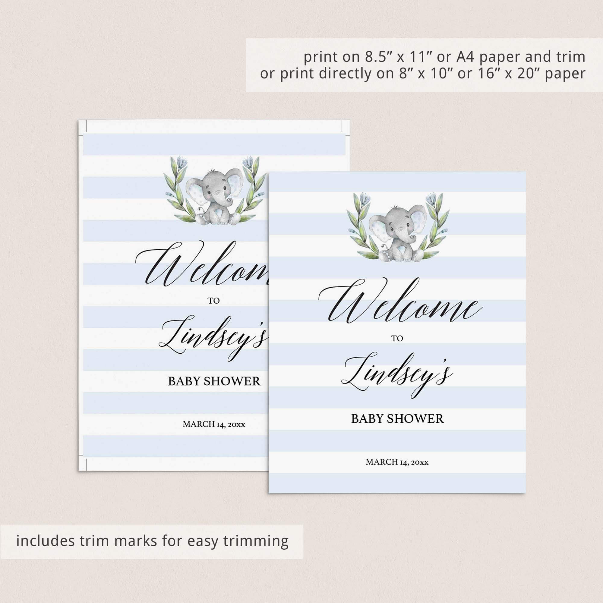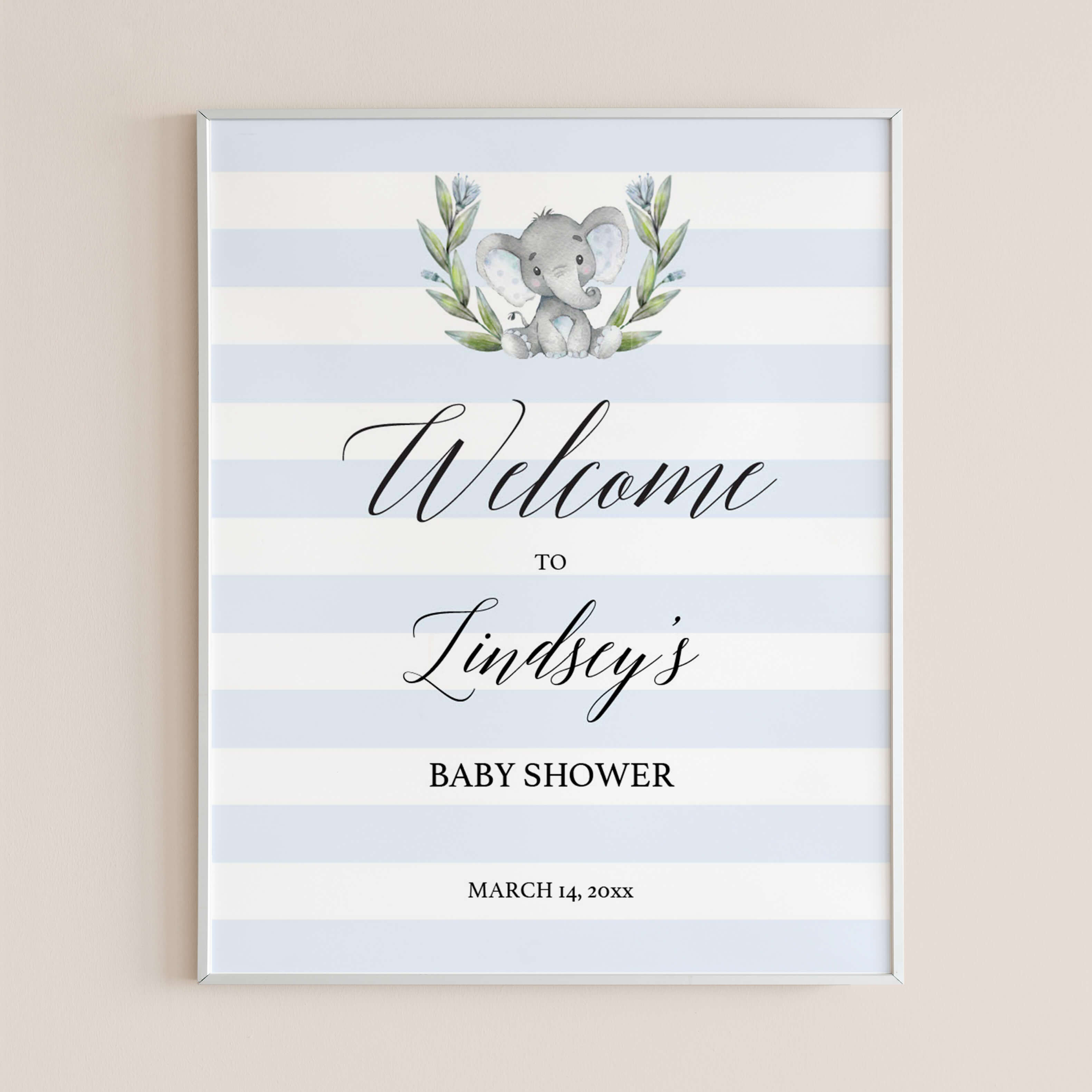 Welcome your baby shower guests to your elephant themed party with this adorable welcome sign with blue and white stripes!