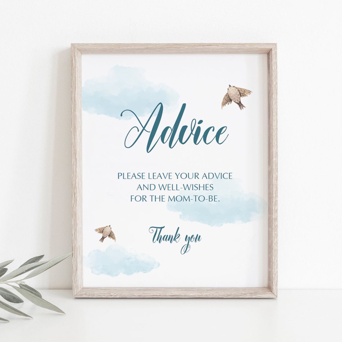 Ask your baby shower guests to leave their words of advice and encouragement for the new mom or new parents with this blue baby shower advice sign with watercolor clouds. The sign is perfect for any boy baby shower.