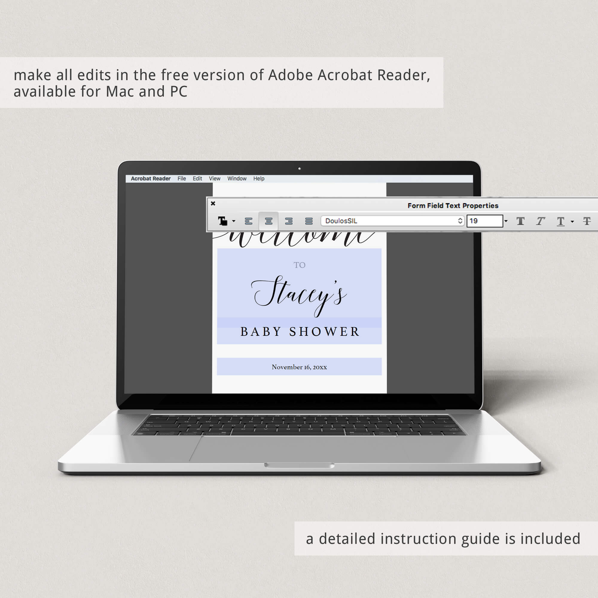 Easily personalize the welcome poster with the guest of honor's name and the date of the baby shower. A detailed instruction guide with tips & tricks on editing, trimming, paper choices and more is included.