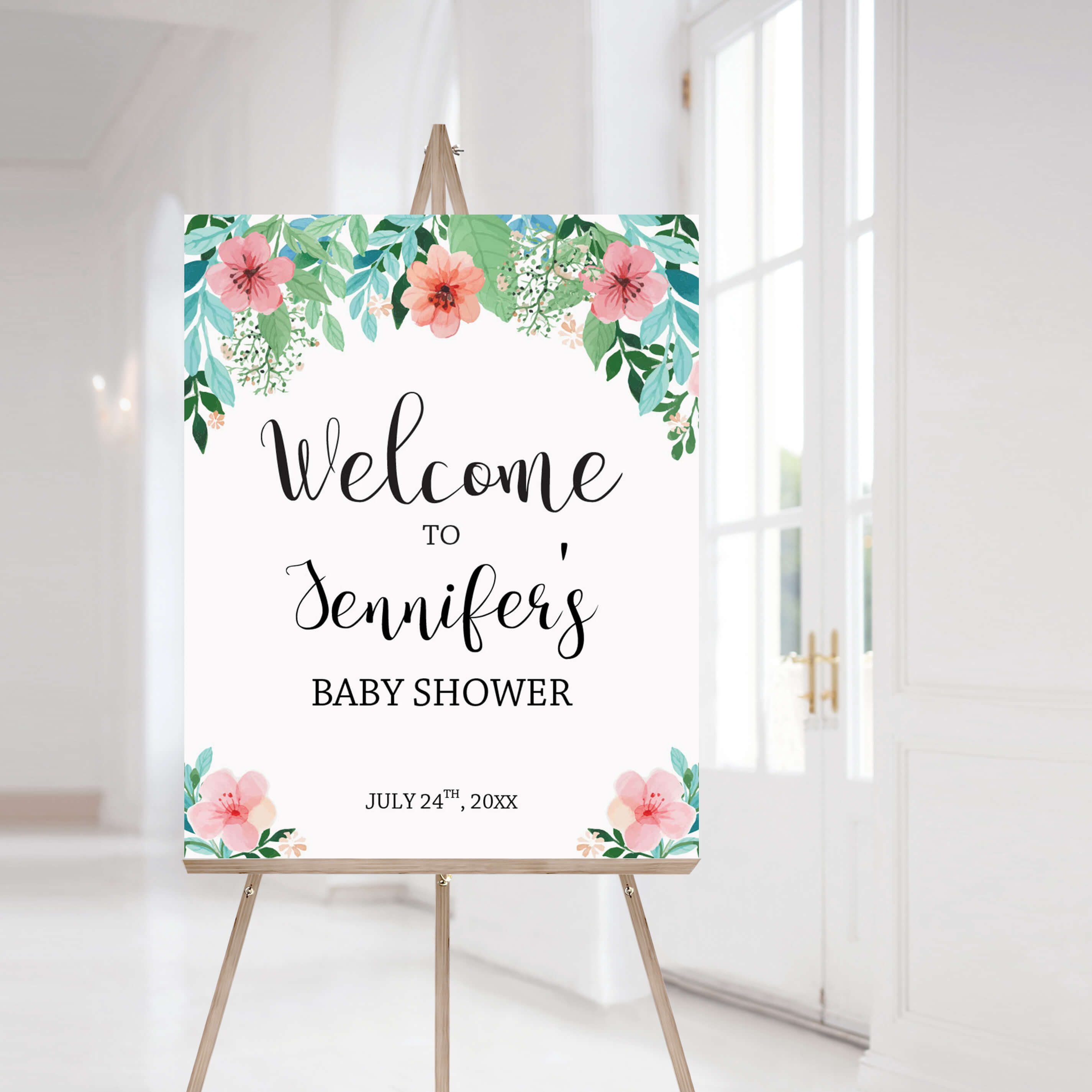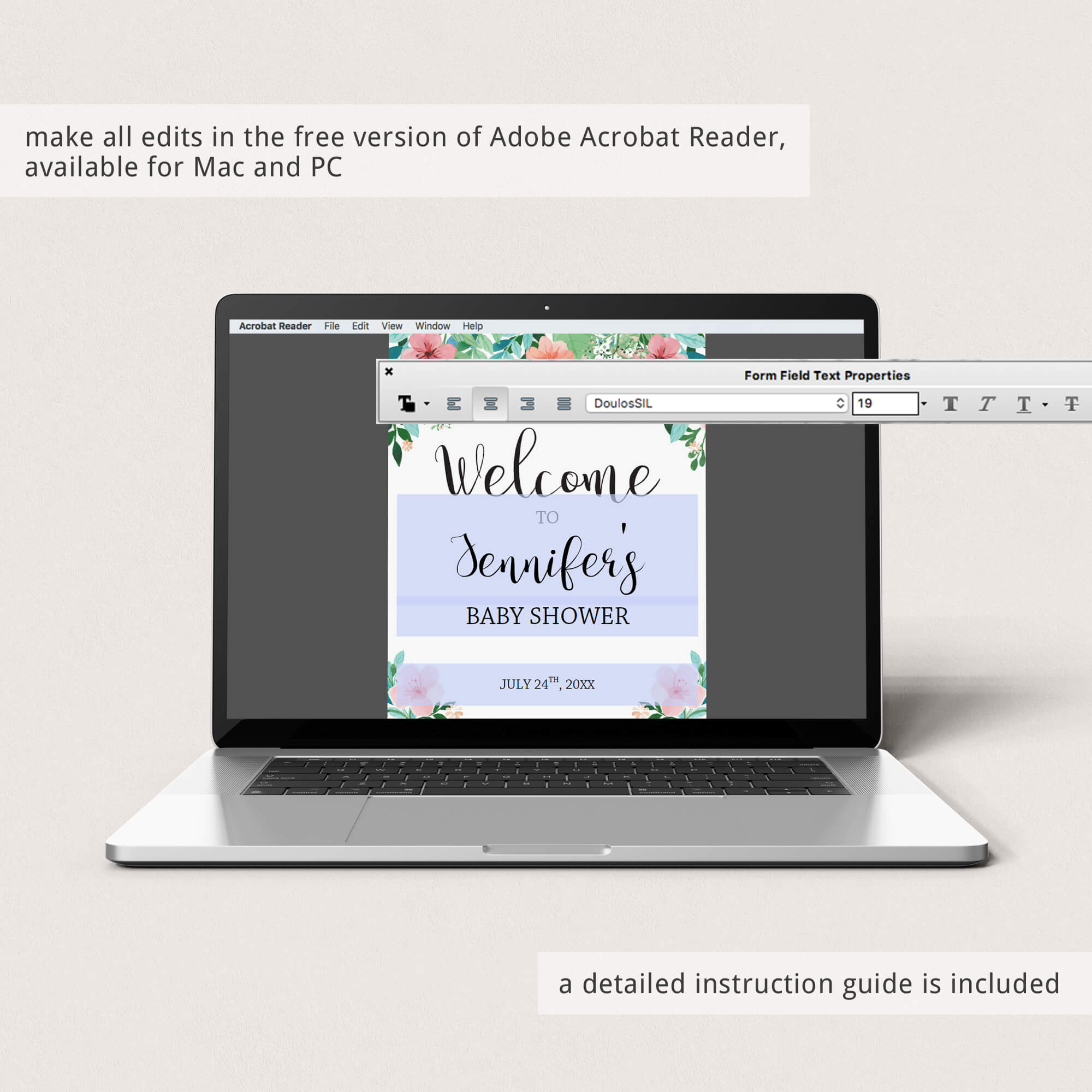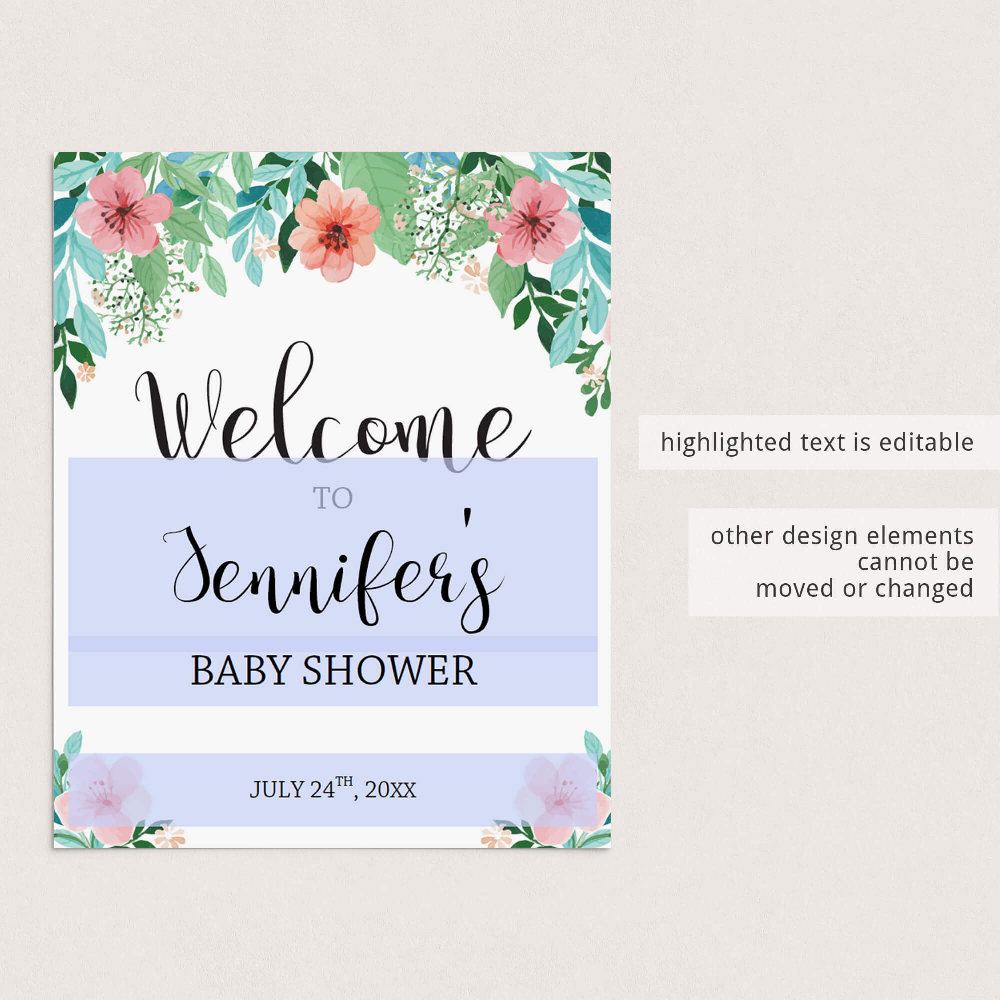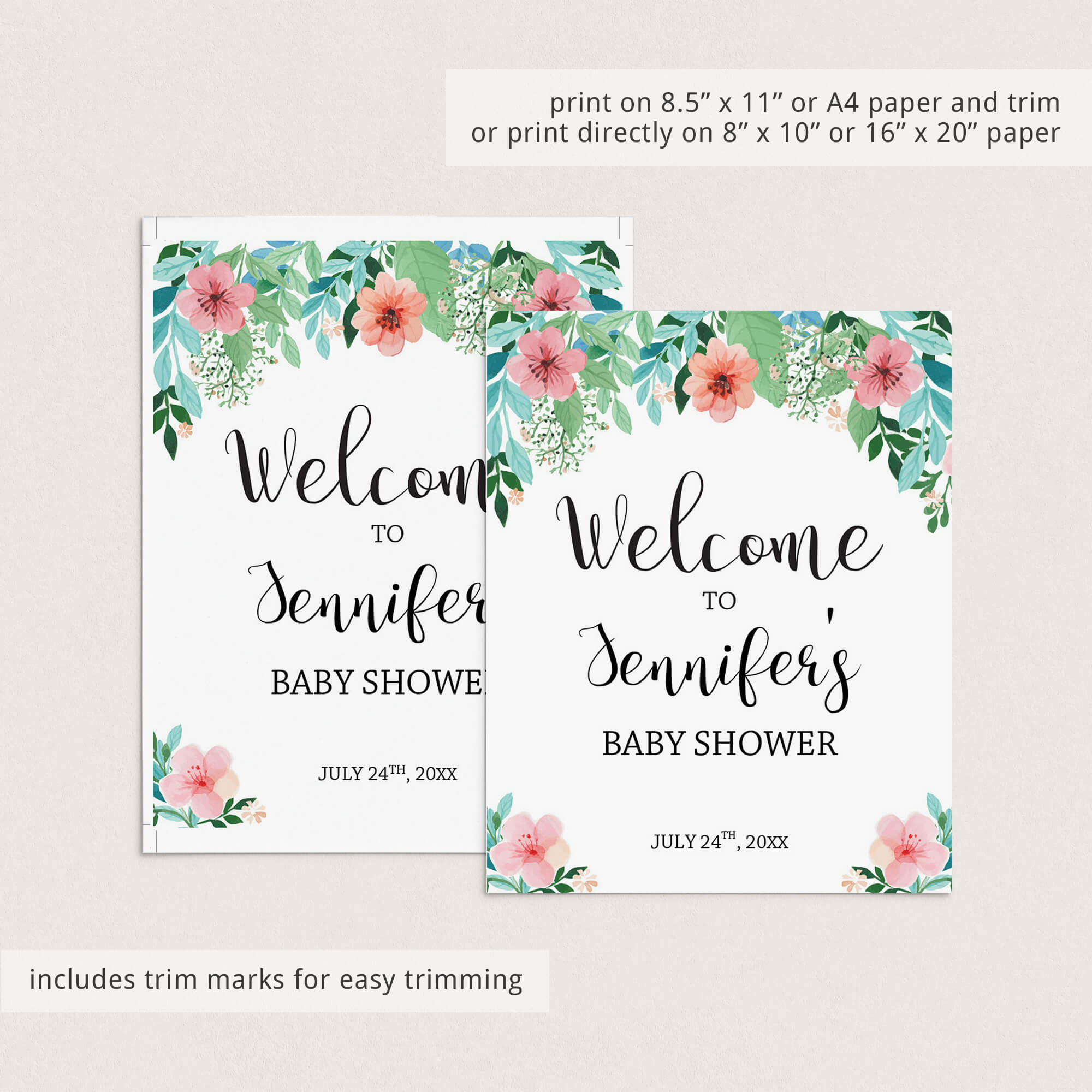 Easily personalize the welcome sign with the guest of honor's name and the date of the baby shower. A detailed instruction guide with tips & tricks on editing, trimming, paper choices and more is included.