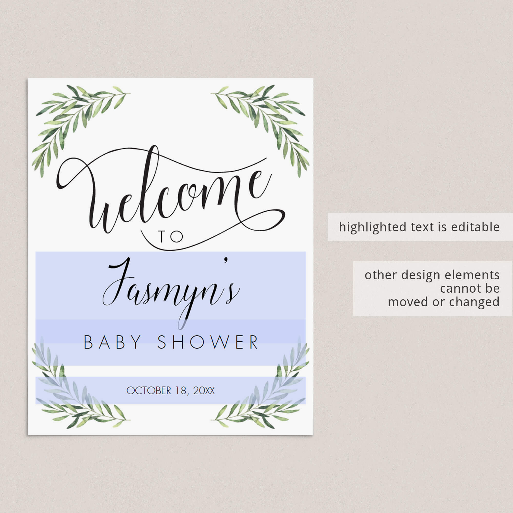 Easily personalize the welcome sign with the guest of honor's name and the date of the baby shower. A detailed instruction guide with tips & tricks on editing, trimming, paper choices and more is included.