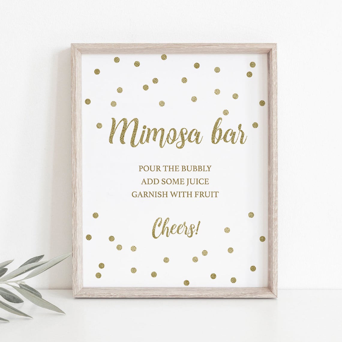 This printable Mimosa Bar sign is an instant download, so simply download and print the sign right from your computer in a matter of minutes. Frame the sign in a cute frame and you’ll create a wonderful looking gold themed party.