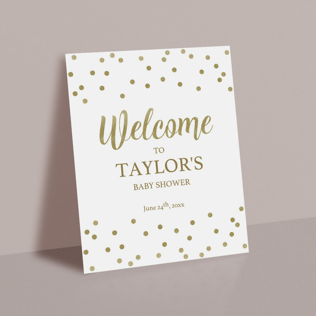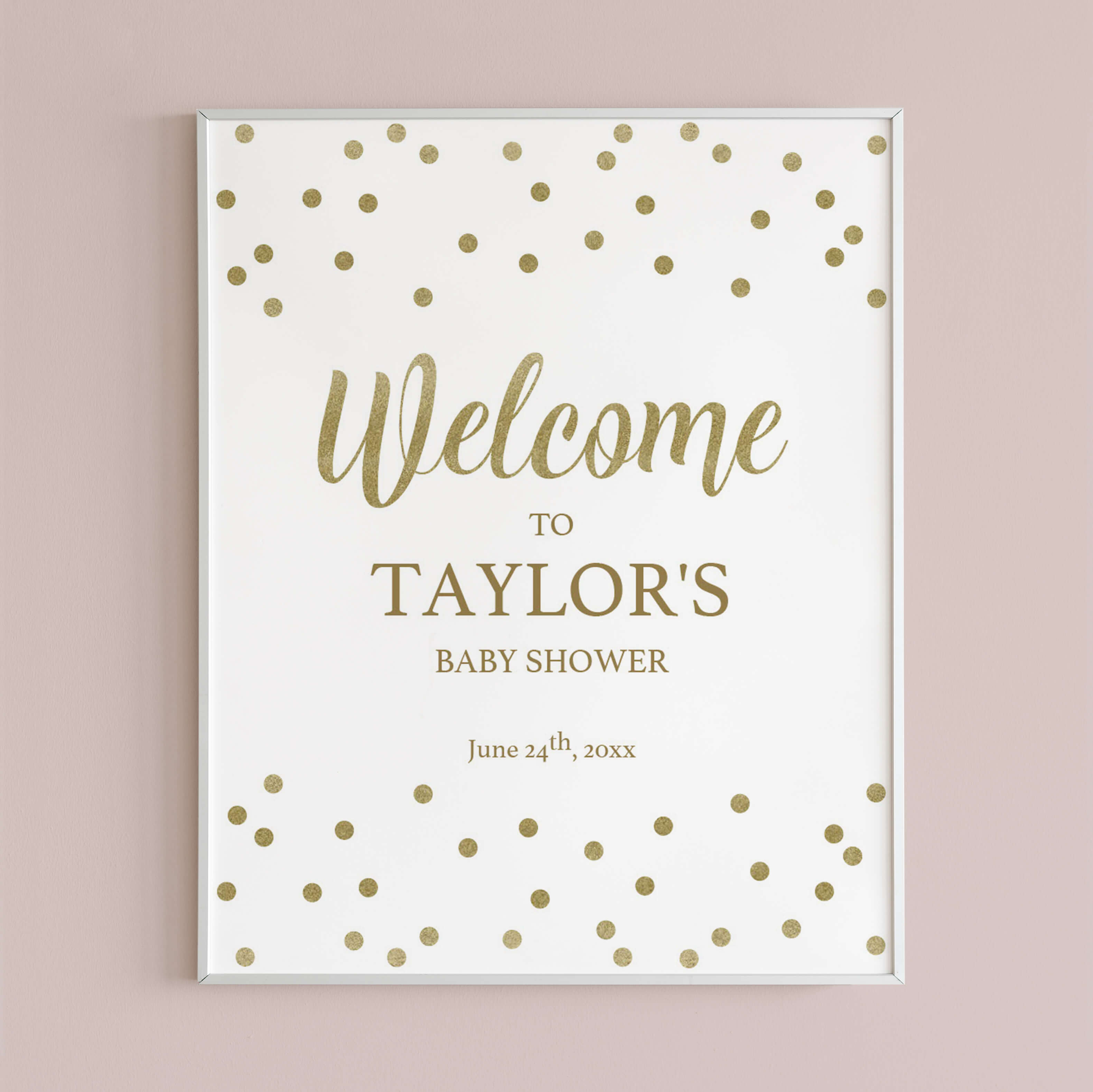 Welcome your guests to your gold themed party with this festive gold confetti welcome sign!