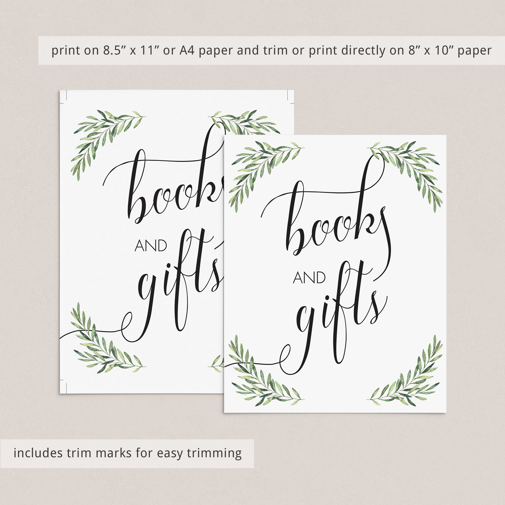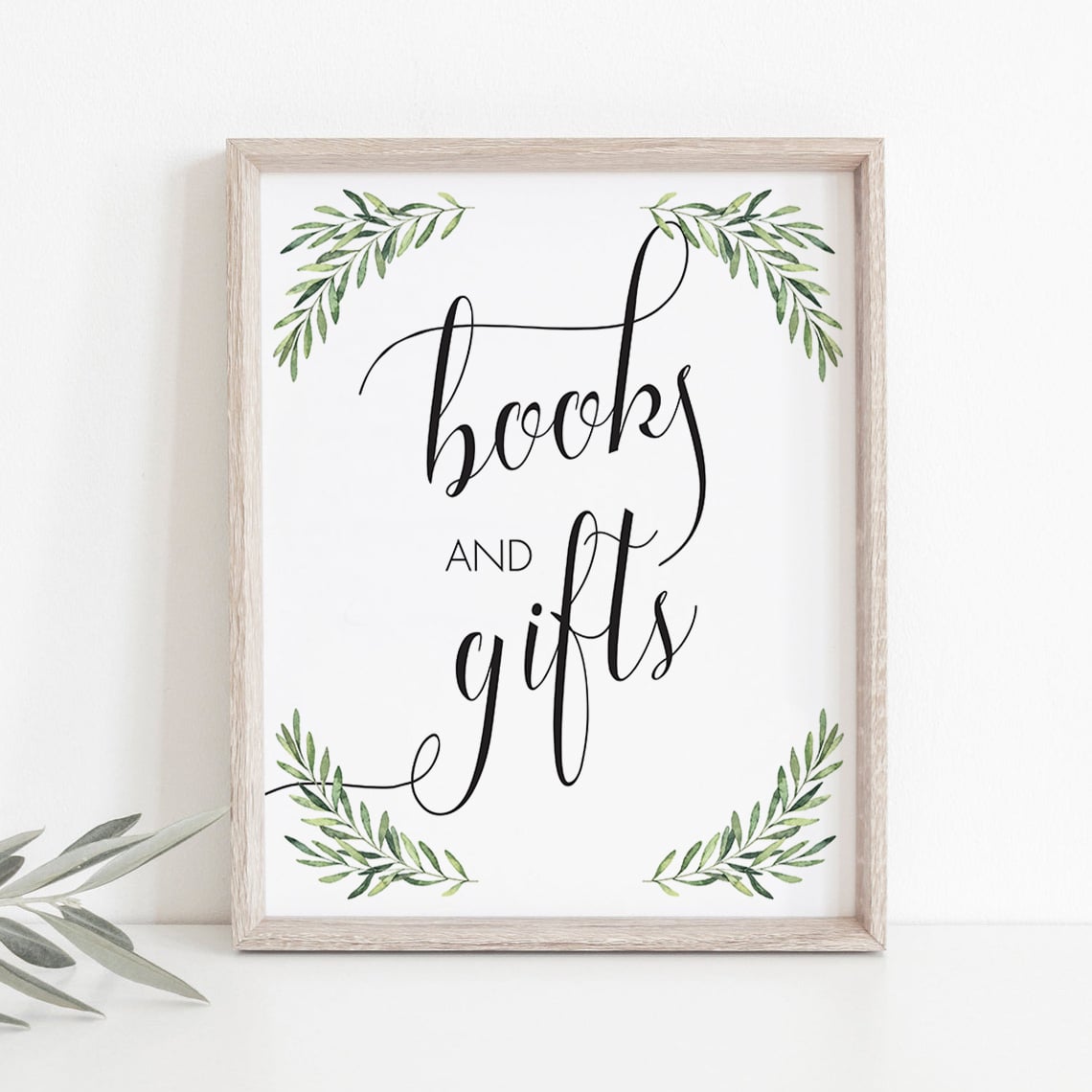 This greenery Books & Gifts sign is an instant downloadable file, so simply download and print the sign right from your computer in a matter of minutes. Frame the sign in a cute frame and place across the gift table or hang on the wall.