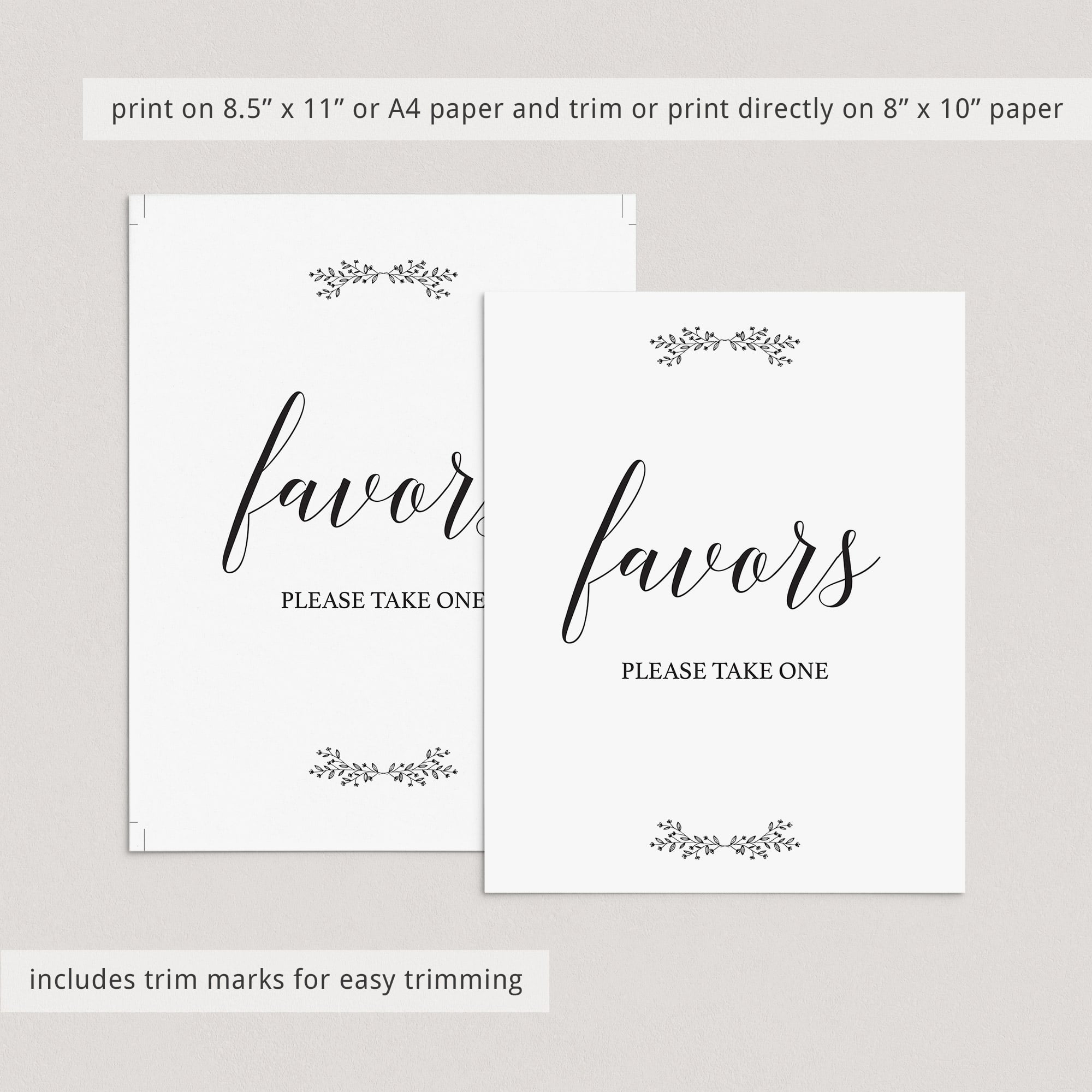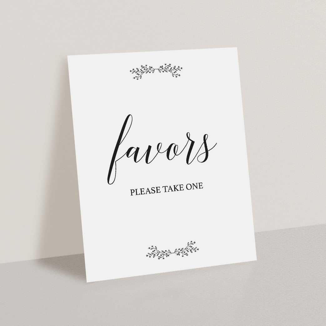 Decorating your event is almost as fun as the party itself! With this minimal rustic Favors sign with black and white leaves, you will add a really great touch to any party.
