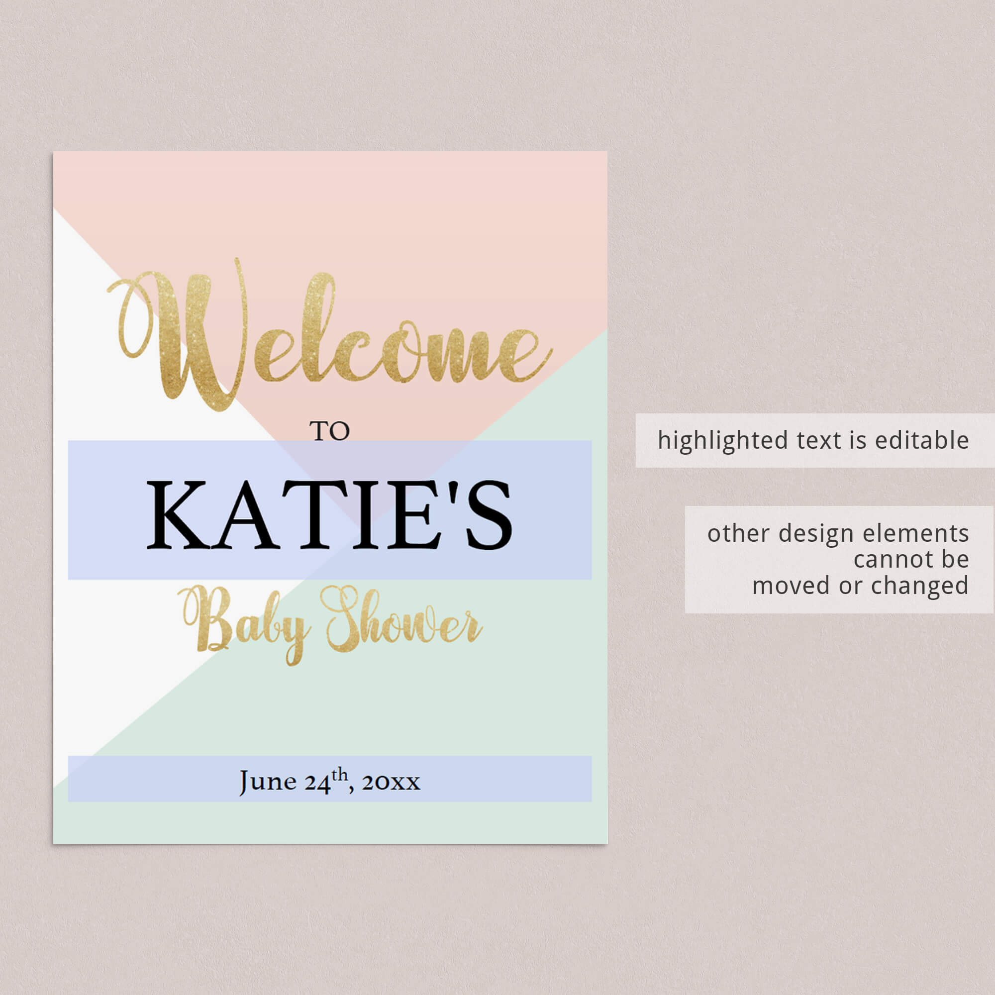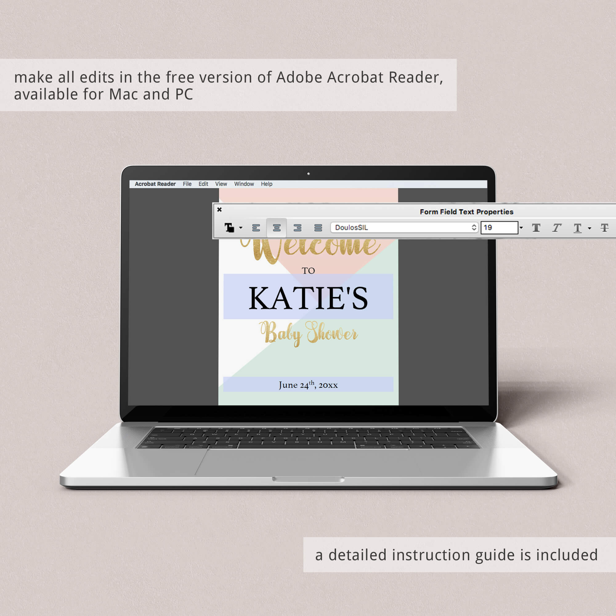 Easily personalize the welcome sign with the guest of honor's name and the date of the baby shower. A detailed instruction guide with tips & tricks on editing, trimming, paper choices and more is included.