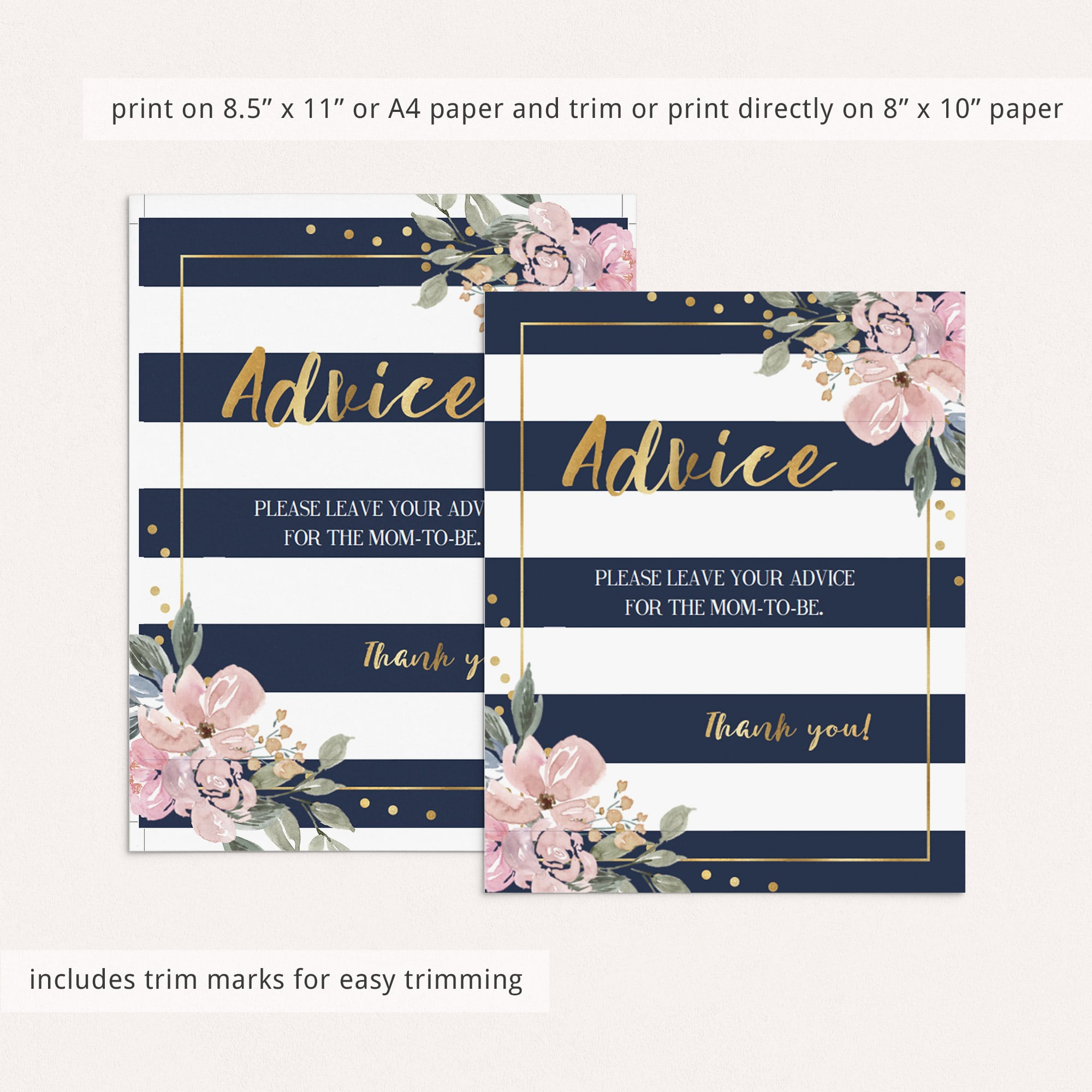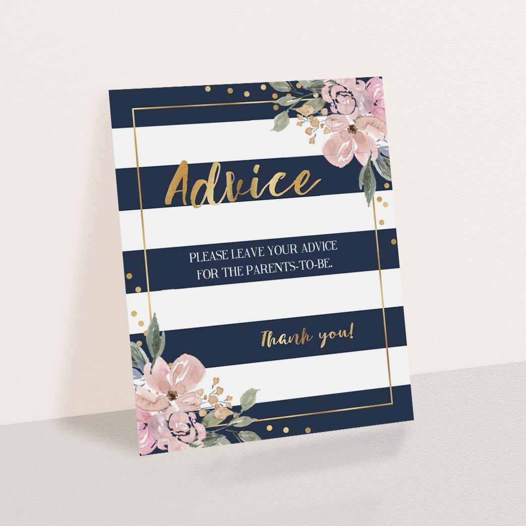 Ask your baby shower guests to leave their words of advice and encouragement for the mom-to-be or parents-to-be with this gorgeous pink, navy and gold advice sign.