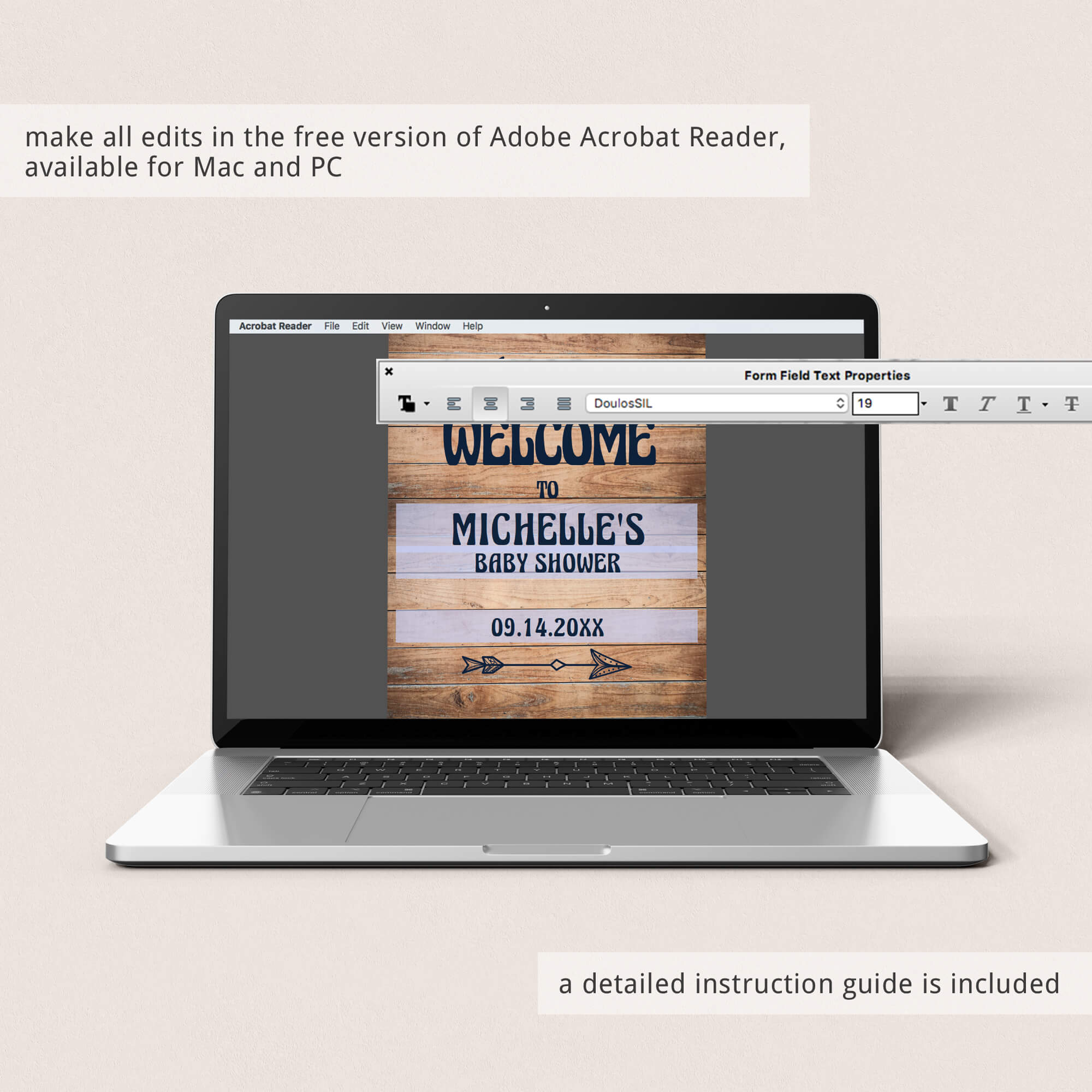 Easily personalize the welcome sign with the guest of honor's name and the date of the event. A detailed instruction guide with tips & tricks on editing, trimming, paper choices and more is included.