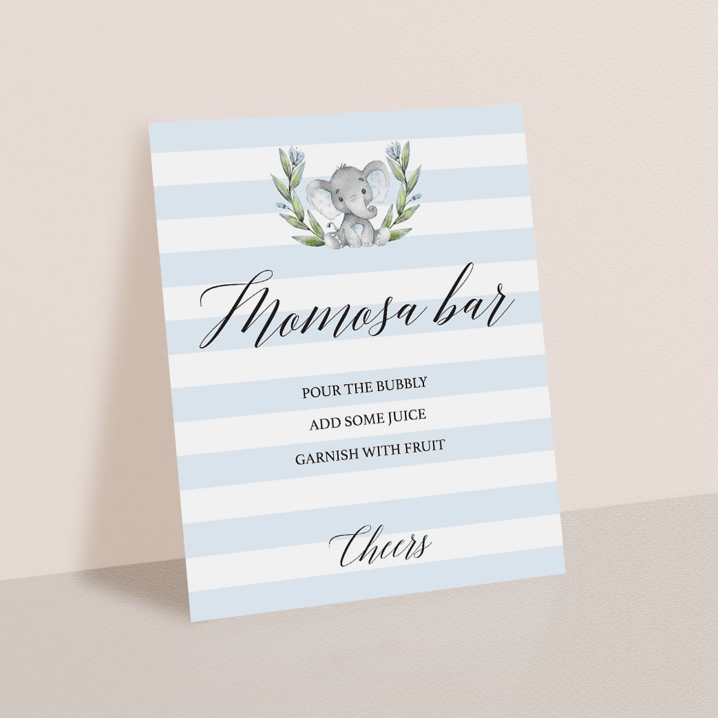 A Mimosa Bar (or as we'd like to call it, a MOM-osa Bar) will take your baby shower to the next level. Use this blue and white striped Momosa Bar sign with watercolor baby elephant to decorate your Mimosa Bar Table and help guests know how to prepare their drinks. You'll easily add a lovely touch to any boy baby shower.