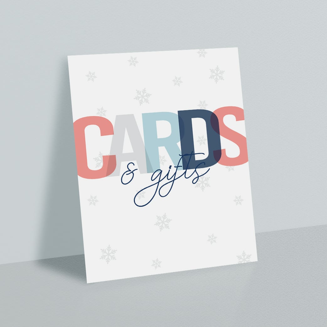 Are you hosting a winter themed shower? Let your guests know where to leave their cards and gifts with this blue and red Cards and Gifts sign with subtle snowflakes. This sign would look great on any winter event where there are gifts.
