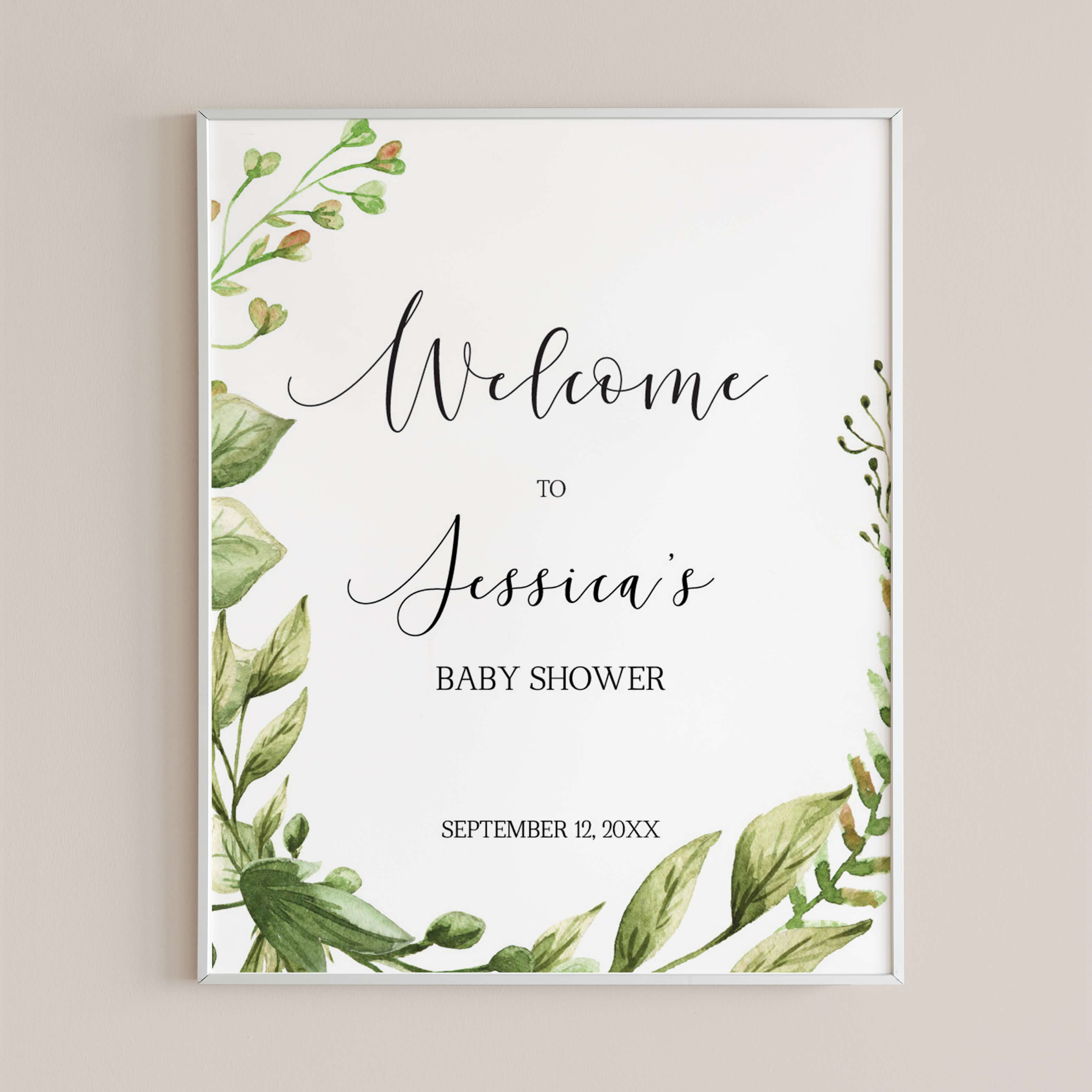 Welcome your guests to your greenery baby shower with this editable welcome sign! With it's watercolor green leaves, it is perfect for a gender neutral or garden party.