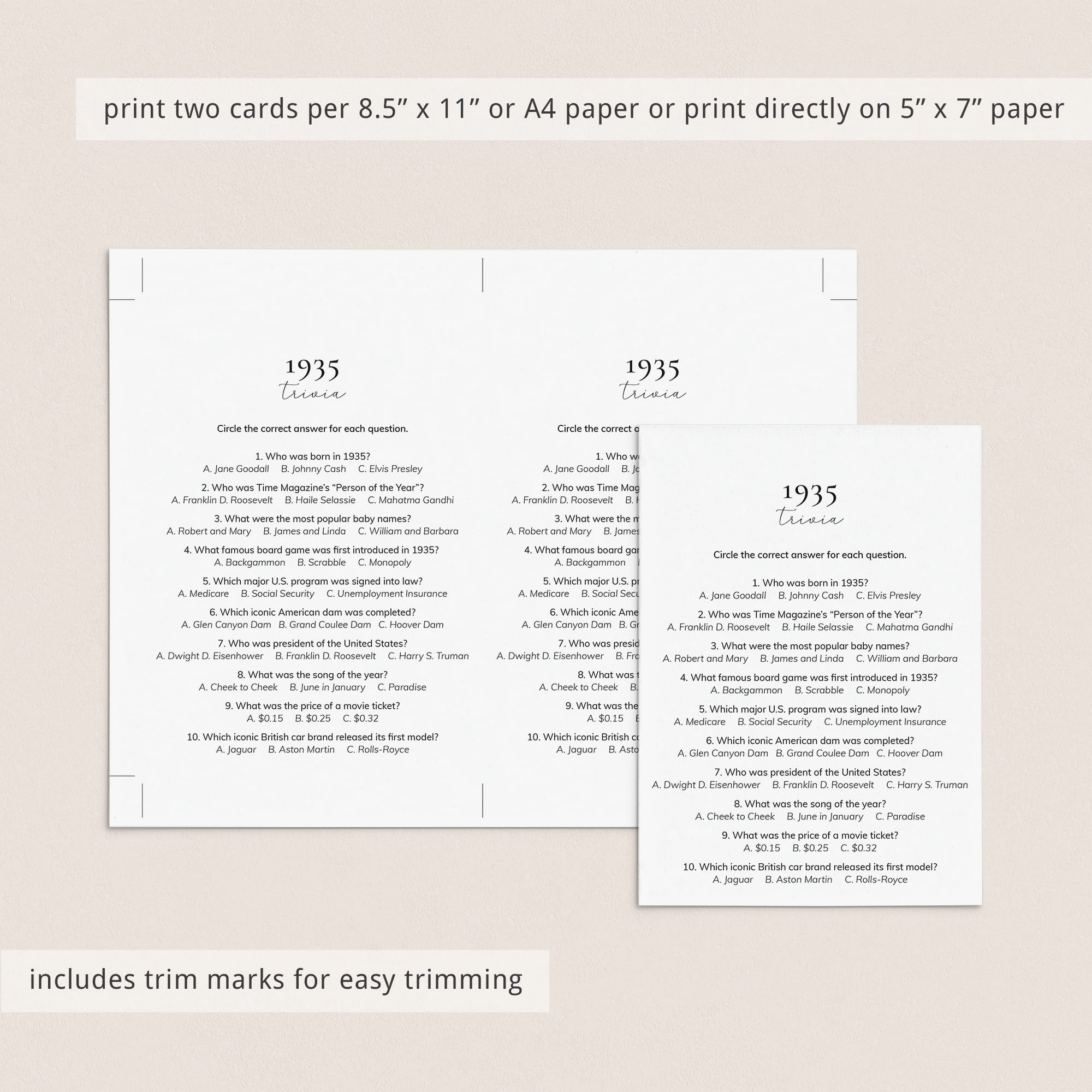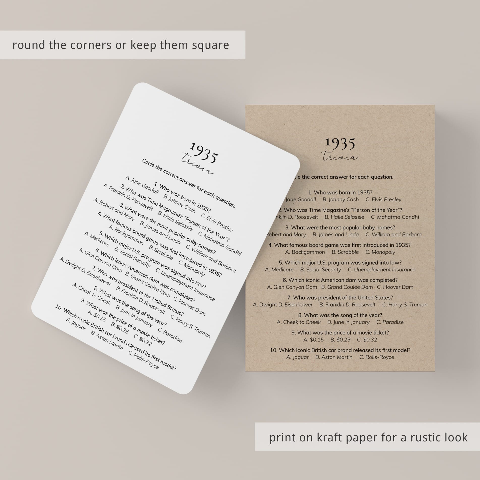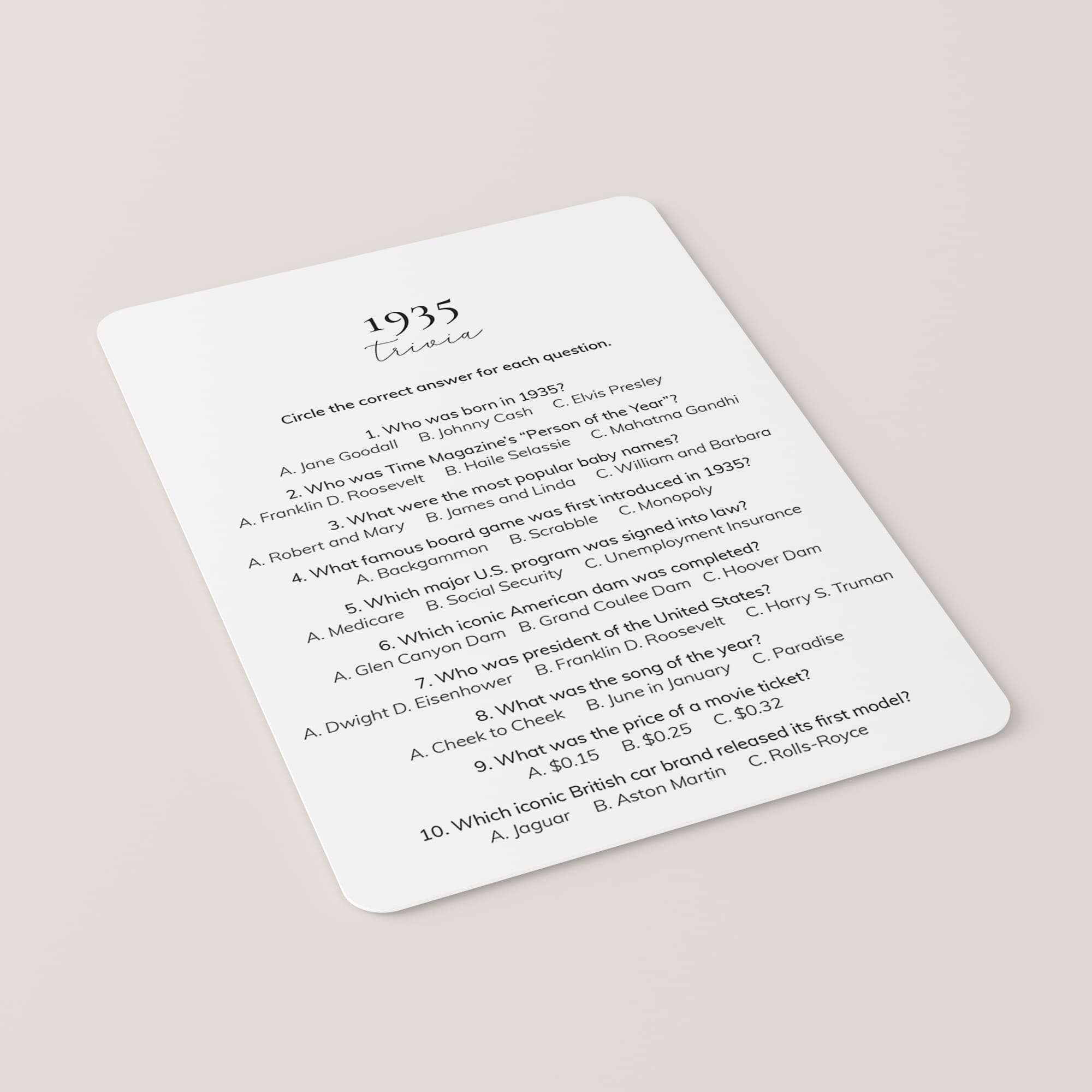 Are you looking for a fun quiz for a 90th birthday party? Look no further! This 1935 Quiz with 10 multiple choice questions is such a fun game to play with your friends and family. Test your guests how well they know 1935's pop culture. It's the perfect addition to a birthday celebration for someone born in 1935.