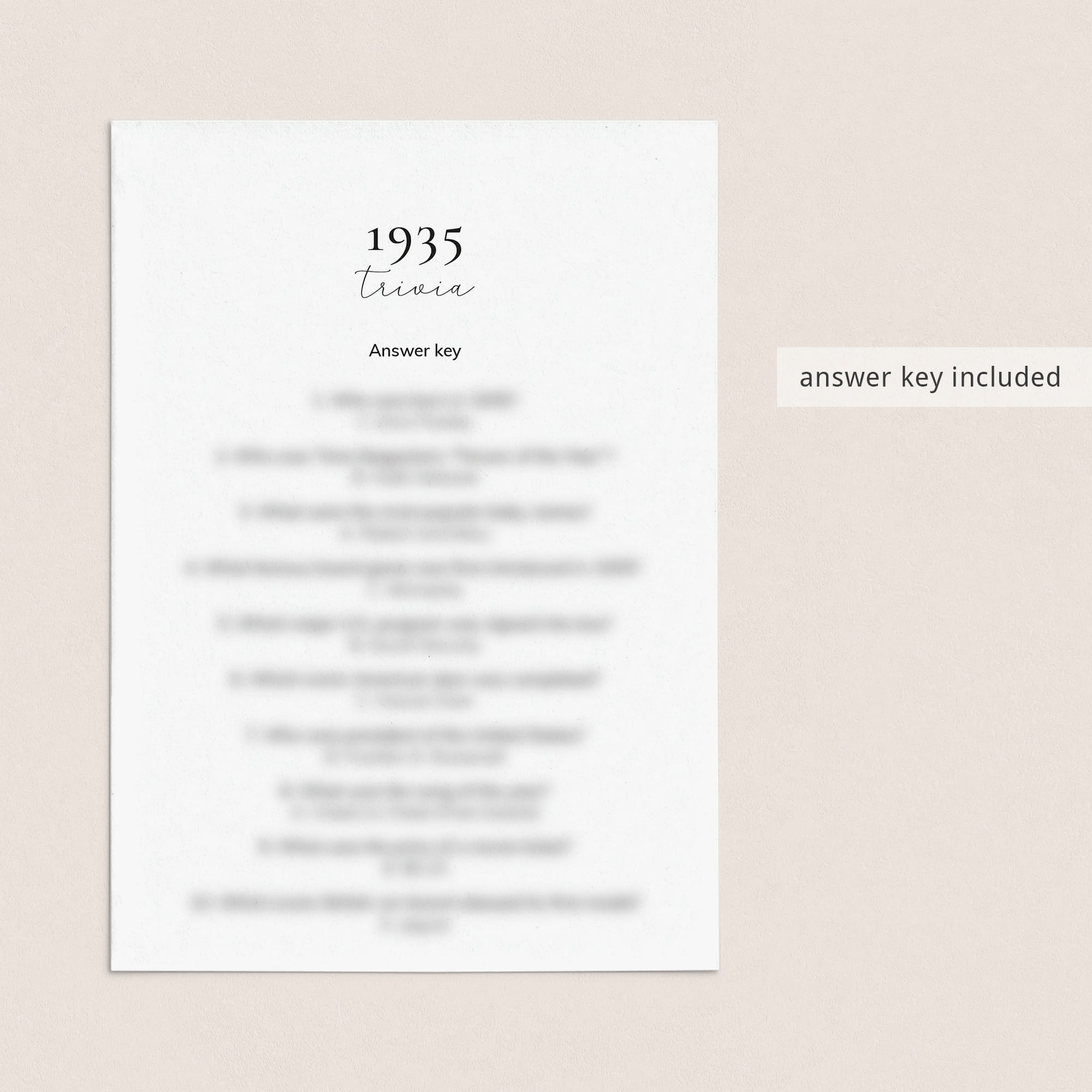 Just in case you are having trouble figuring out the answers, an answer key with the year 1935 quiz answers is included.
