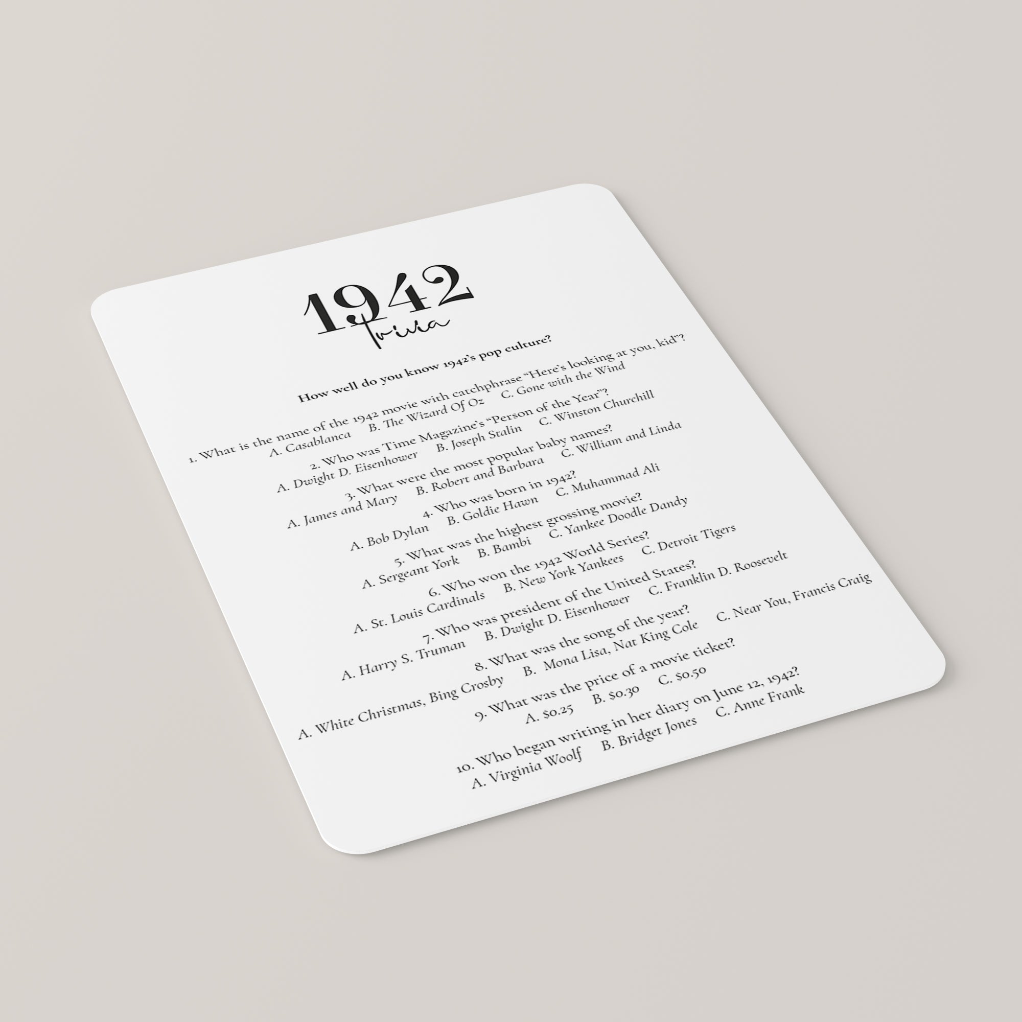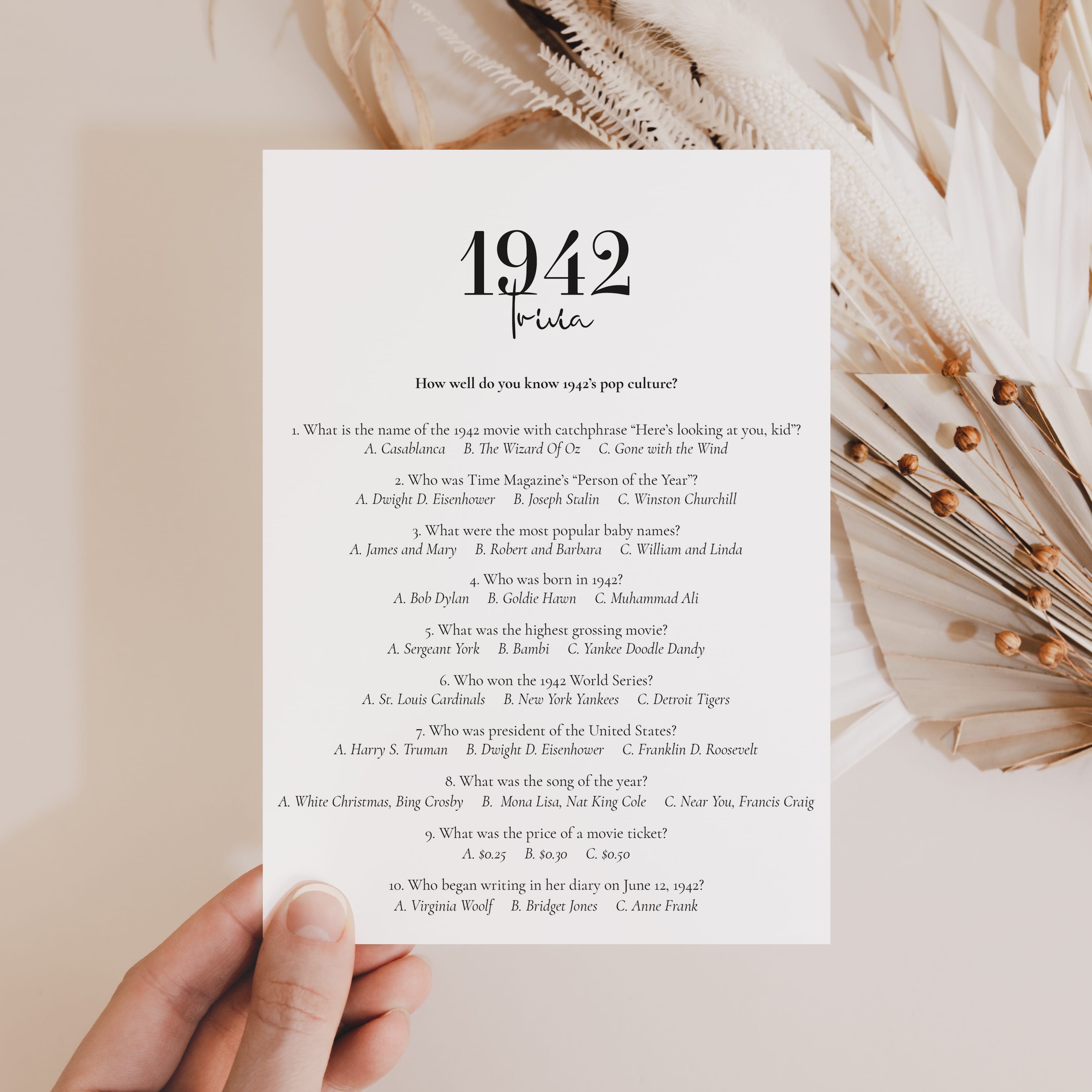 Are you looking for a fun game for an 83rd birthday party? Look no further! This 1942 trivia with 10 multiple choice questions is such a fun game to play with your friends and family. Test your guests how well they know 1942's pop culture.
