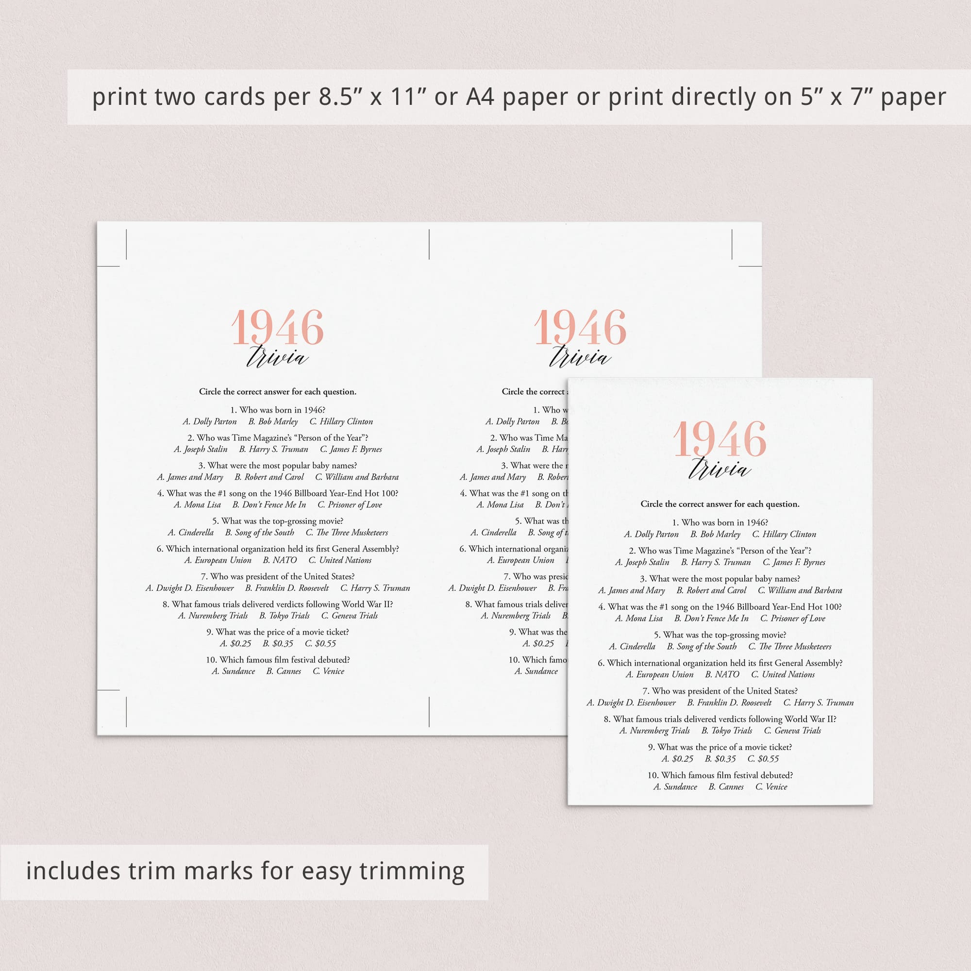This 1946 trivia is a digital download. After purchase you will receive a download link immediately on screen. Also within minutes of your order and payment, an e-mail will be sent to you with a link for your download.