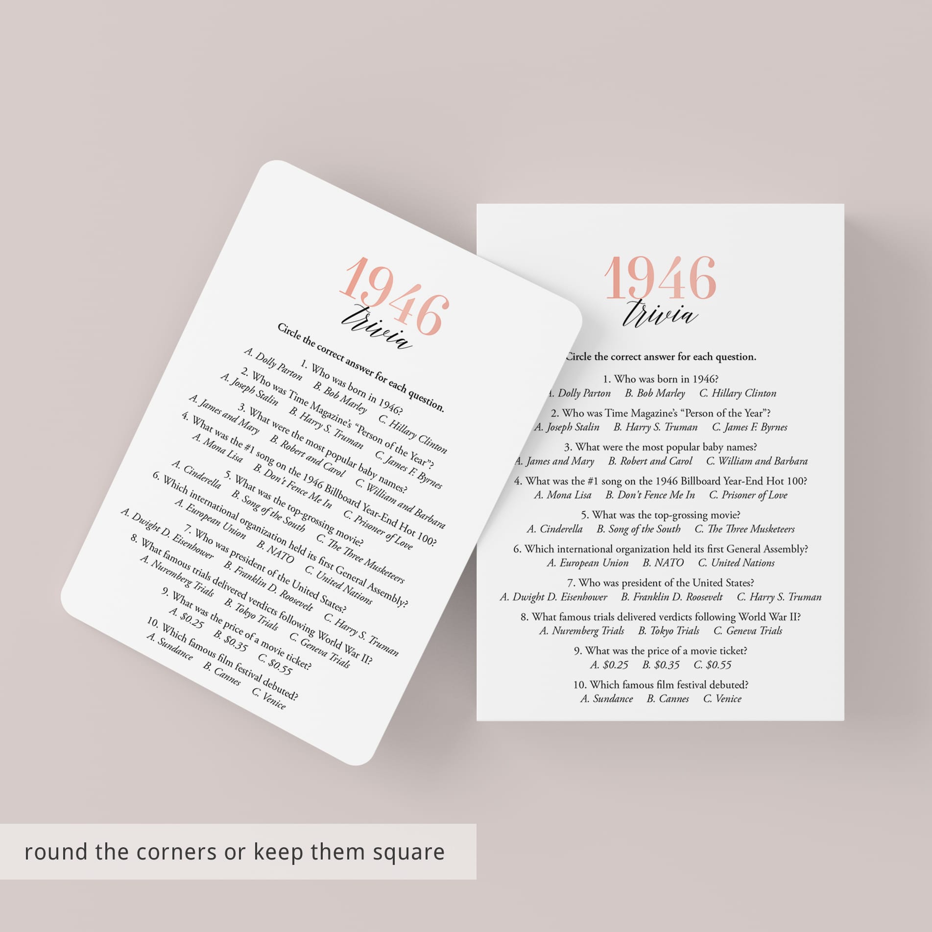 Are you looking for a fun game for a woman's 80th birthday party? Look no further! This 1946 Trivia, with 10 multiple-choice questions, is perfect for celebrating with friends and family. Test your guests’ knowledge of 1946 pop culture!