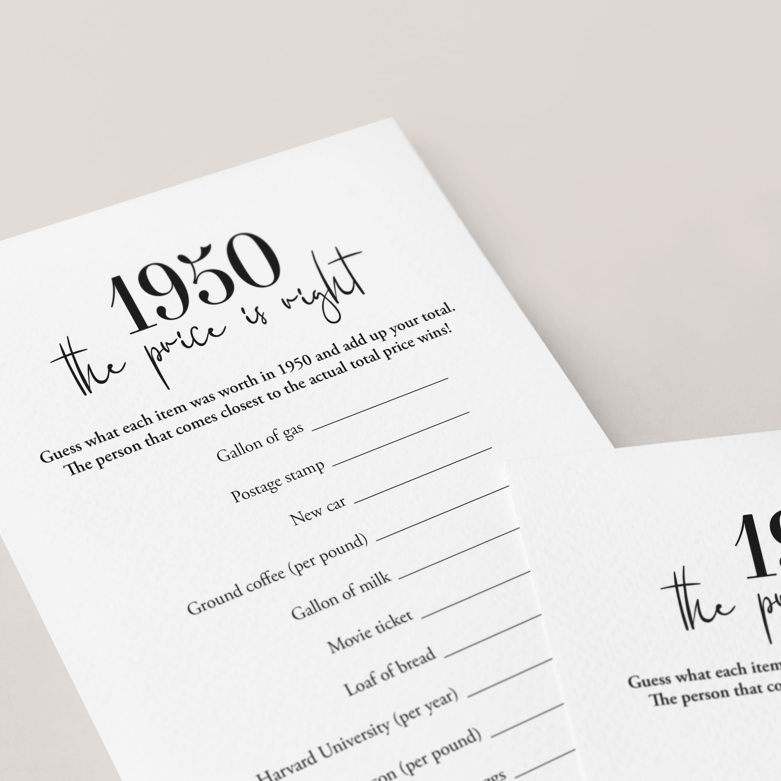 To determine the ultimate winner, simply add up everyone's guesses and see who comes closest to the actual total of these 1950 prices. It's a game of memory and estimation that will have your guests engaged and reminiscing about the good ol' days.