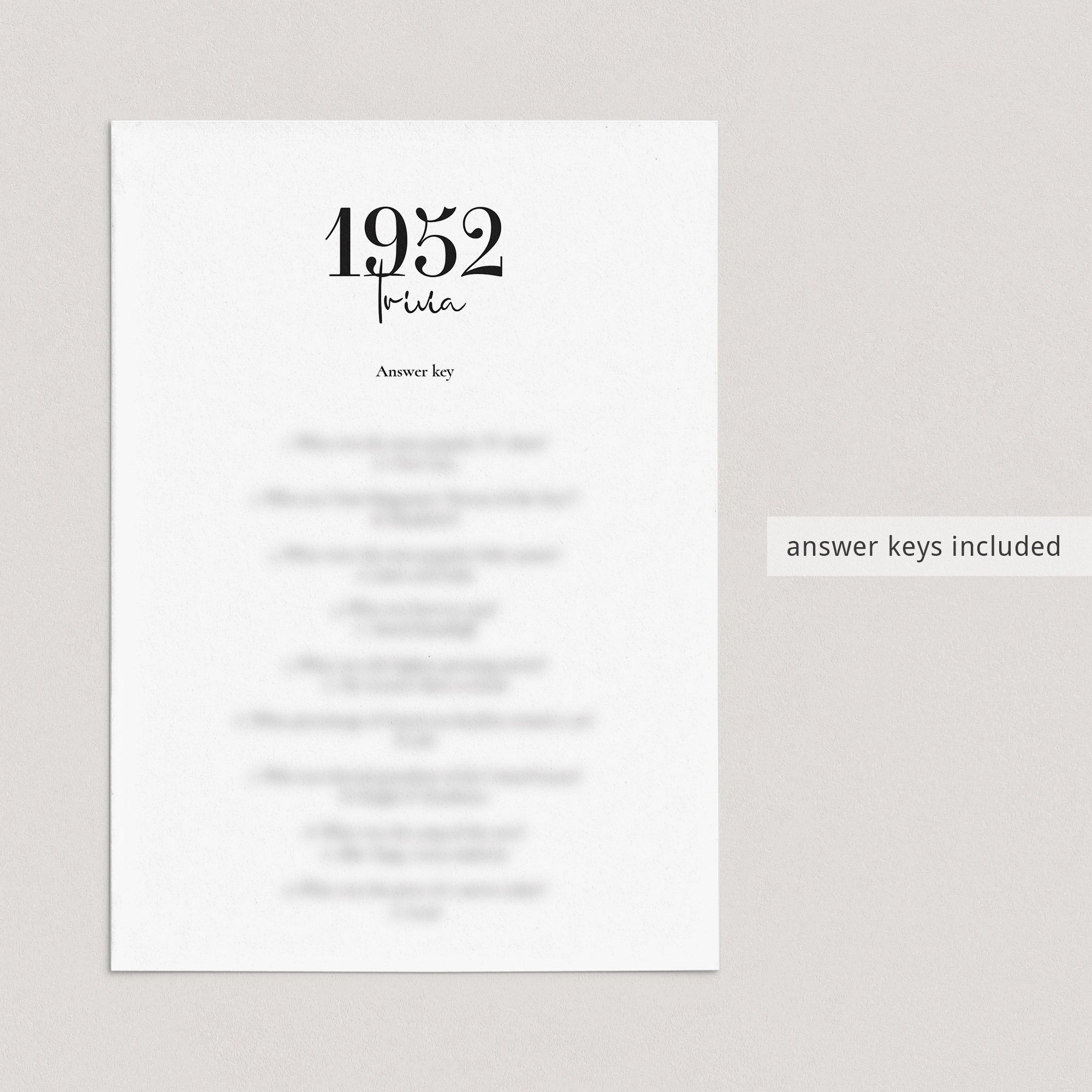 Just in case you are having trouble figuring out the answers, an answer key with the 1952 trivia answers is included.