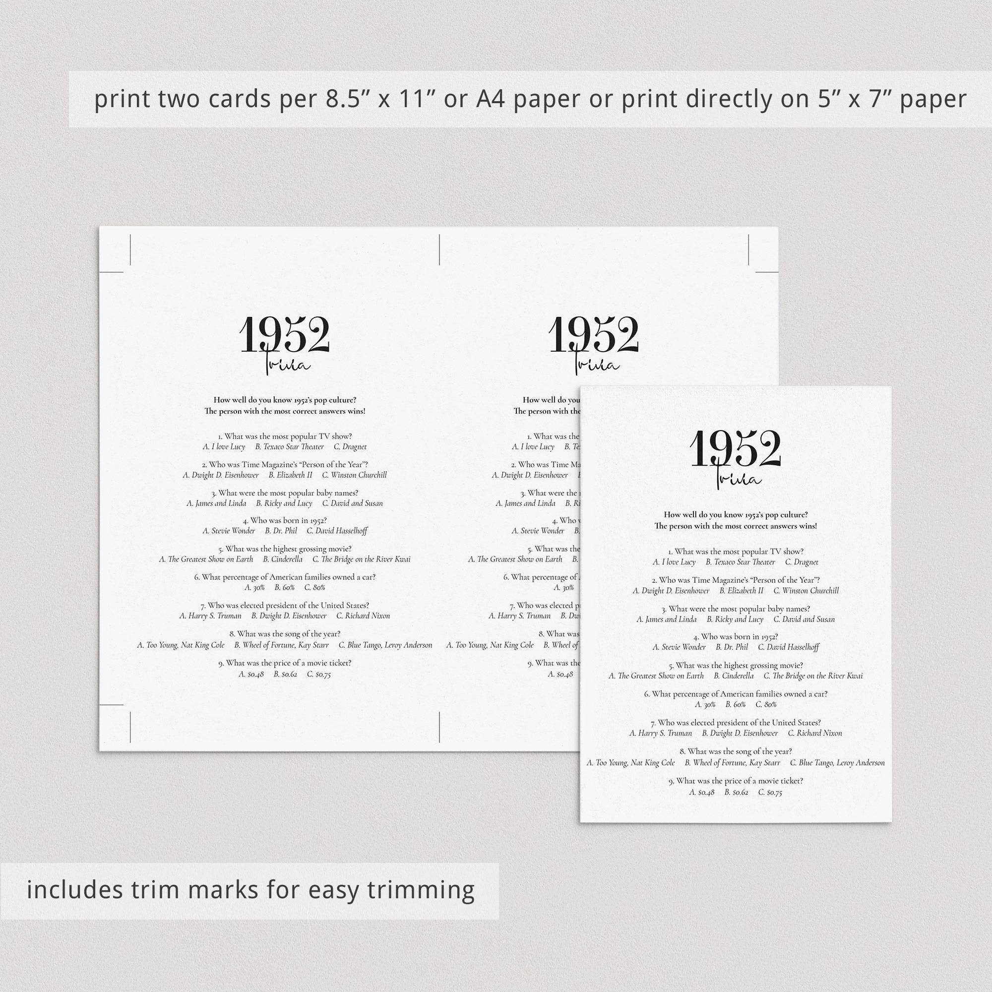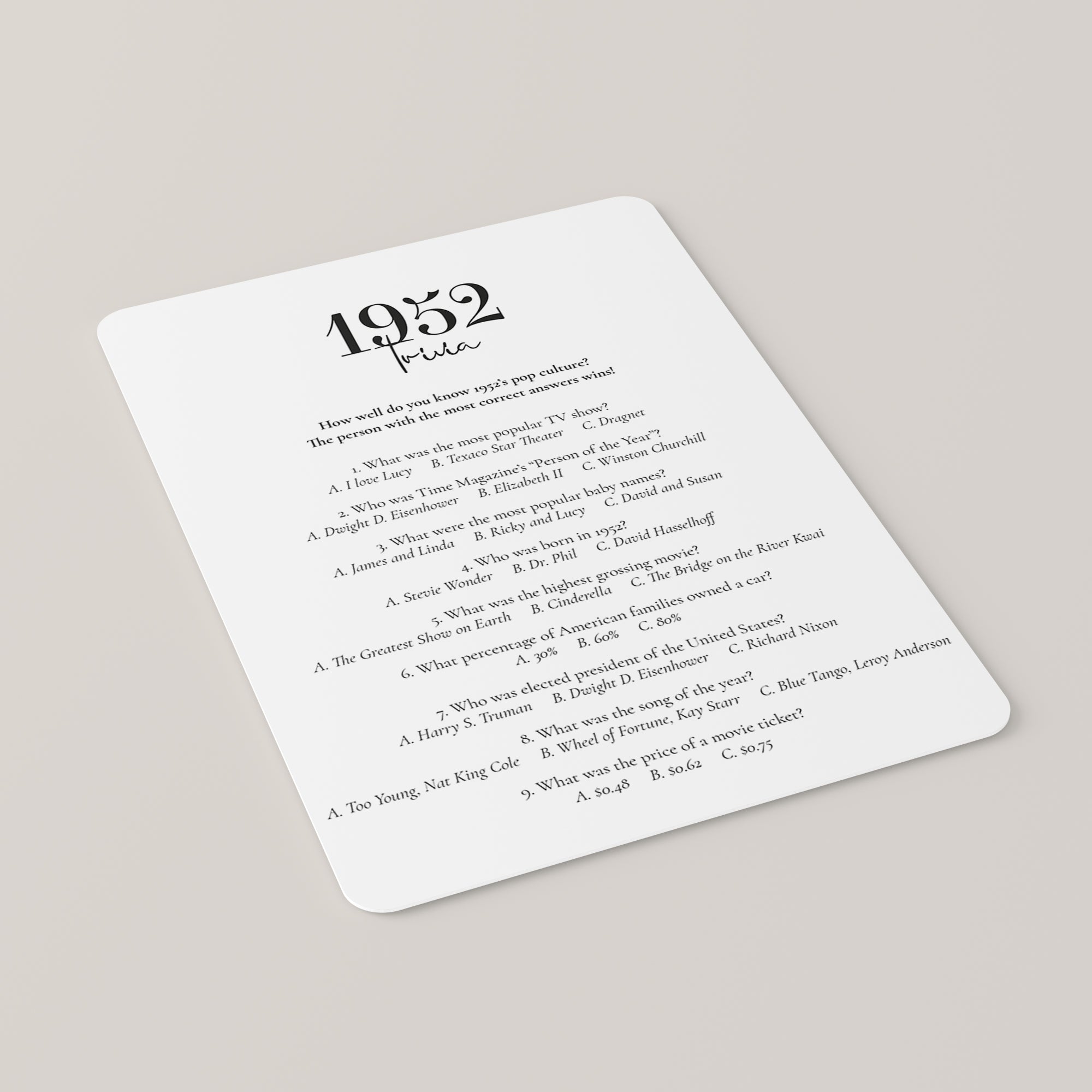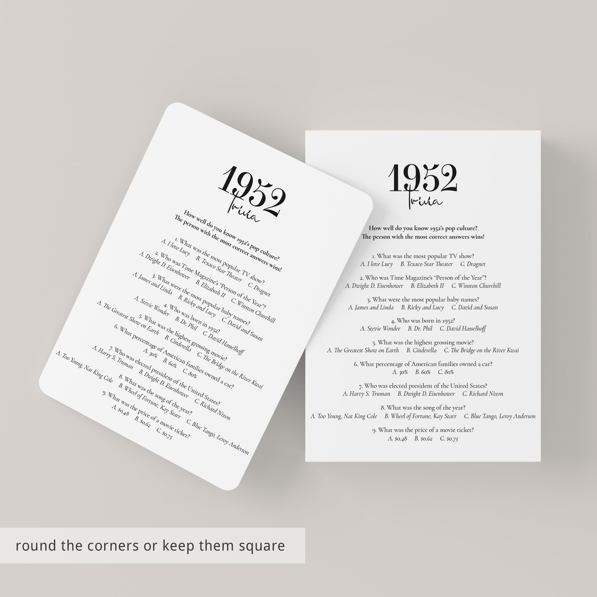 Are you looking for a fun game for a 73rd birthday party? Look no further! This 1952 trivia is such a fun game to play with your friends and family. Test your guests how well they know 1952's pop culture.