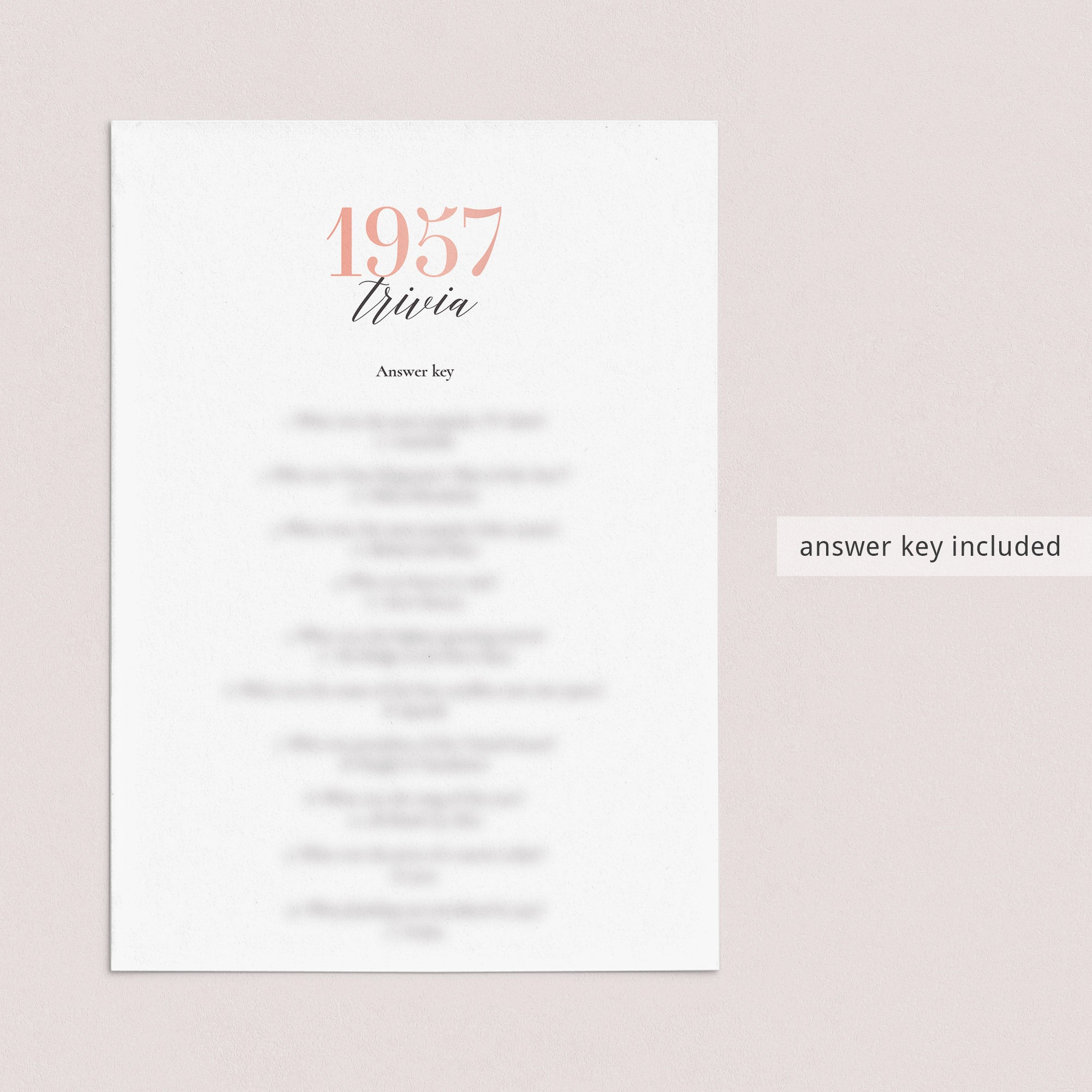 Just in case you are having trouble figuring out the answers, an answer key with the 1957 trivia answers is included.