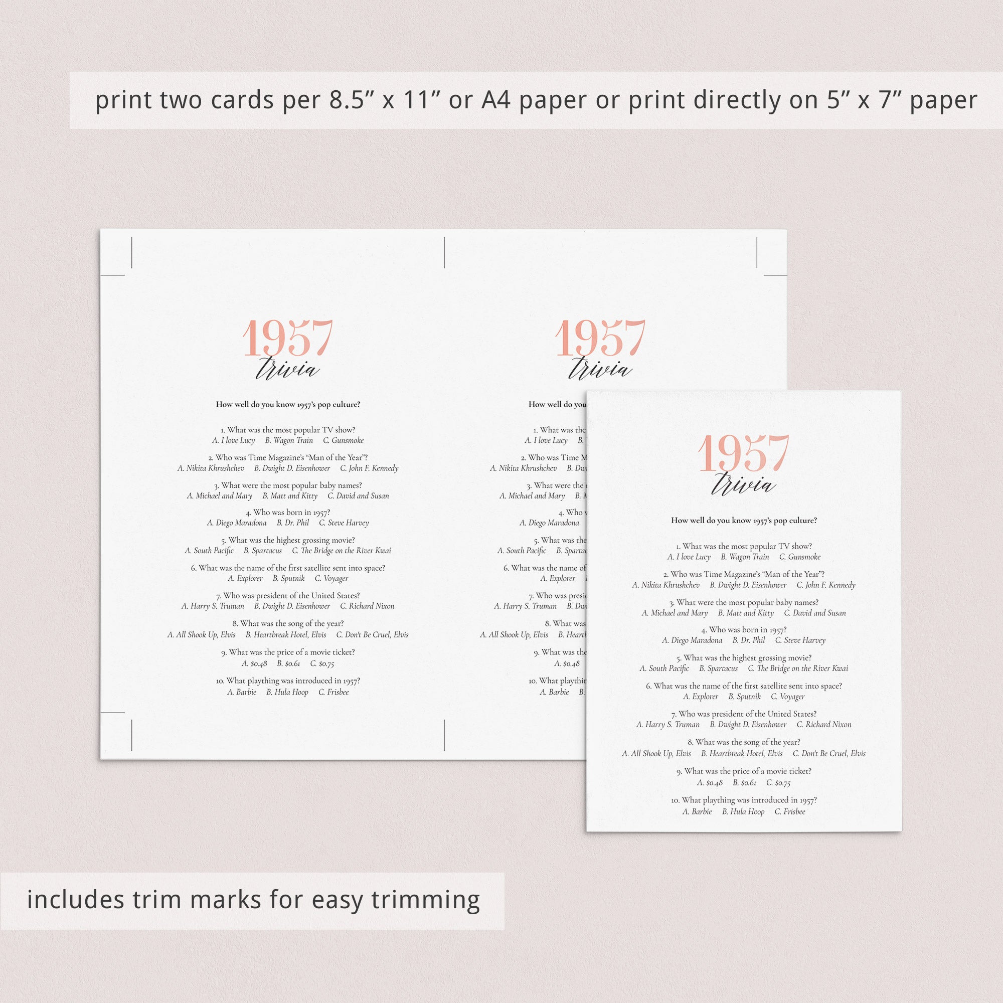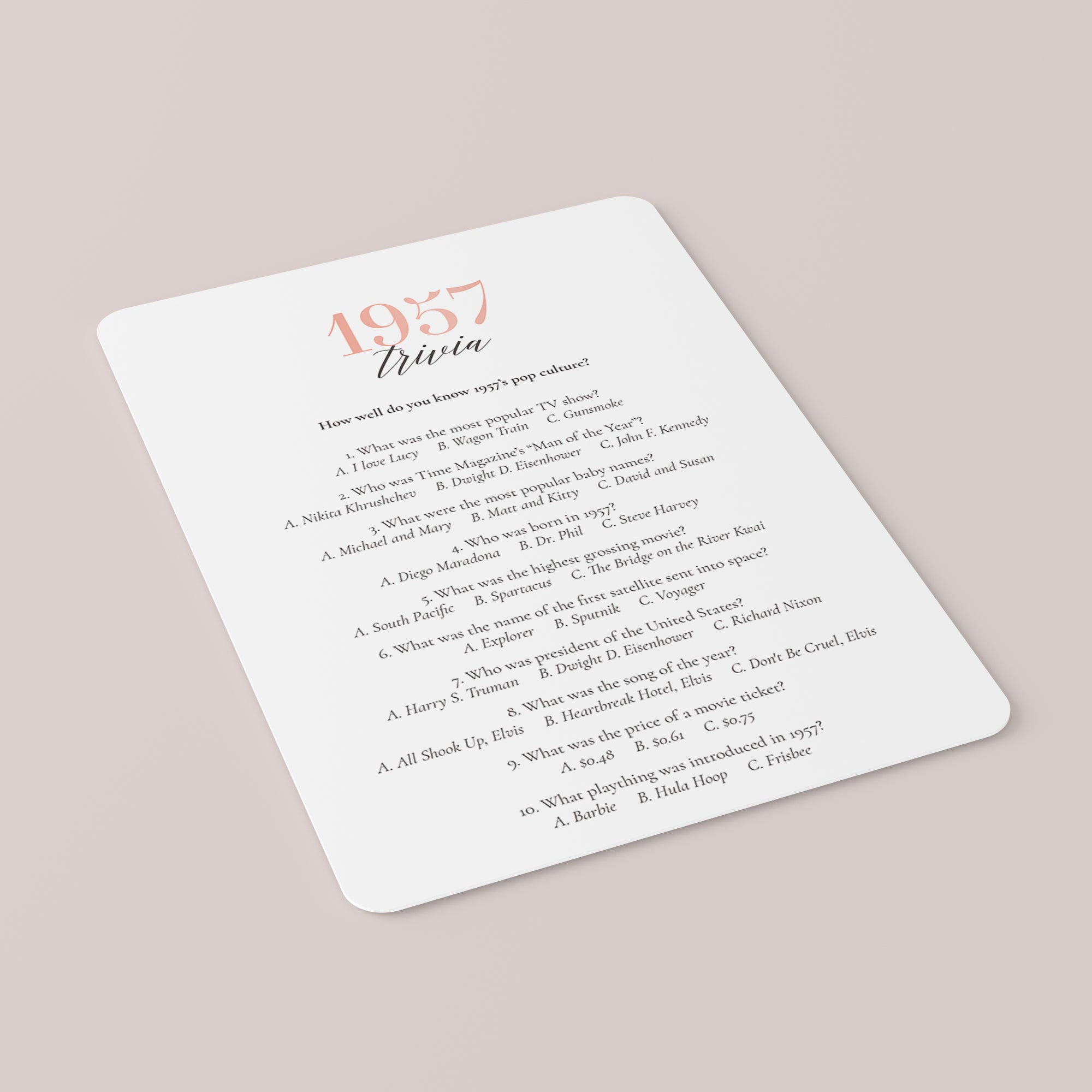 Are you looking for a fun game for a women's 68th birthday party? Look no further! This modern blush 1957 trivia is such a fun game to play with your friends and family. Test your guests how well they know 1957's pop culture.