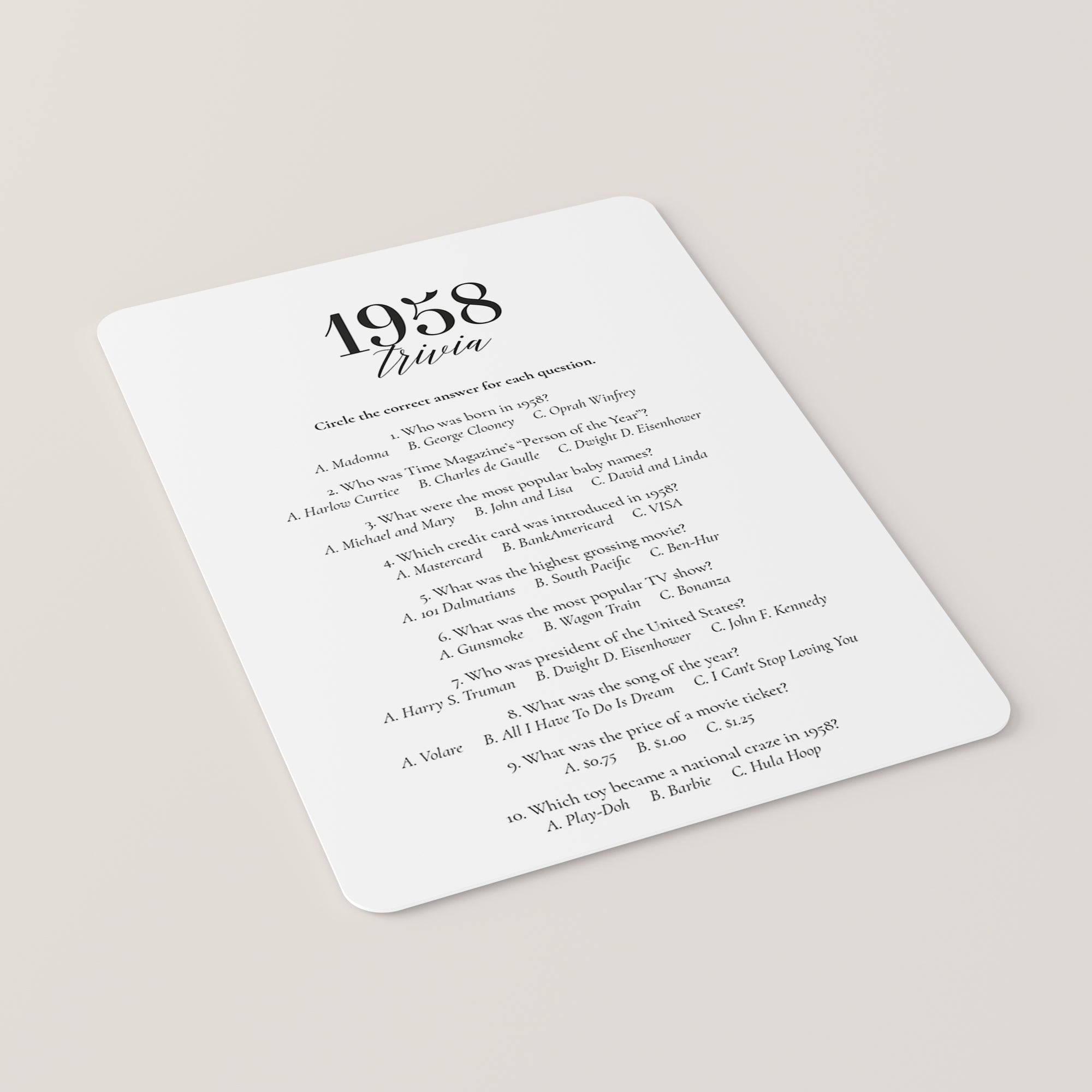 Are you looking for a fun game for a 67th birthday party or 67th anniversary? Look no further! This 1958 fun facts quiz with 10 multiple choice questions is such a fun trivia game to play with your friends and family. Test your guests how well they know 1958's pop culture. It's the perfect addition to a birthday party for someone born in 1958 or to an anniversary party for a couple married in 1958.