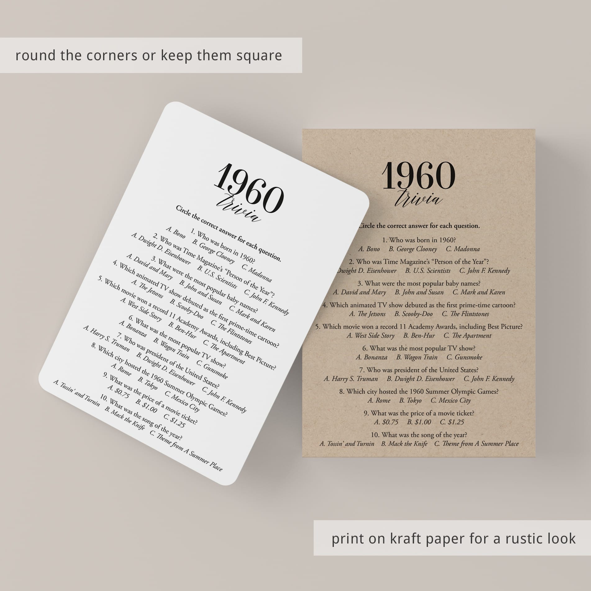 This fun facts about 1960 quiz is a digital download. After purchase you will receive a download link immediately on screen. Also within minutes of your order and payment, an e-mail will be sent to you with a link for your download.