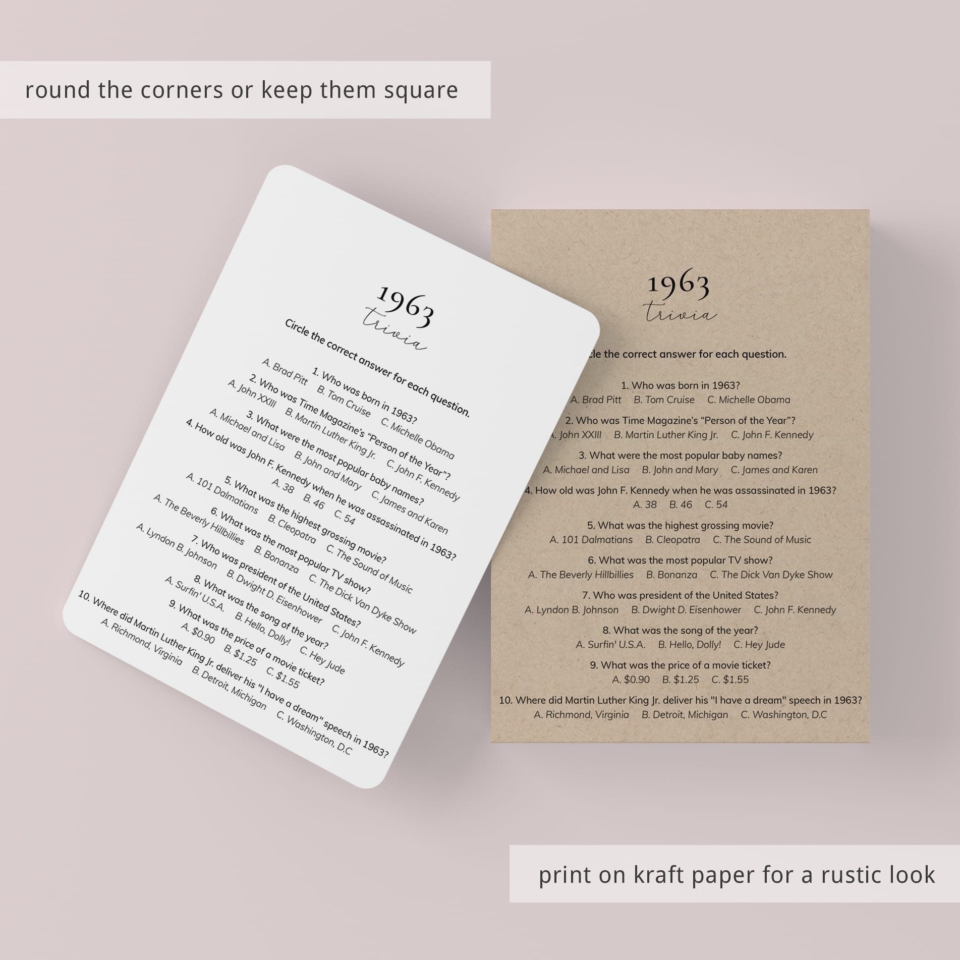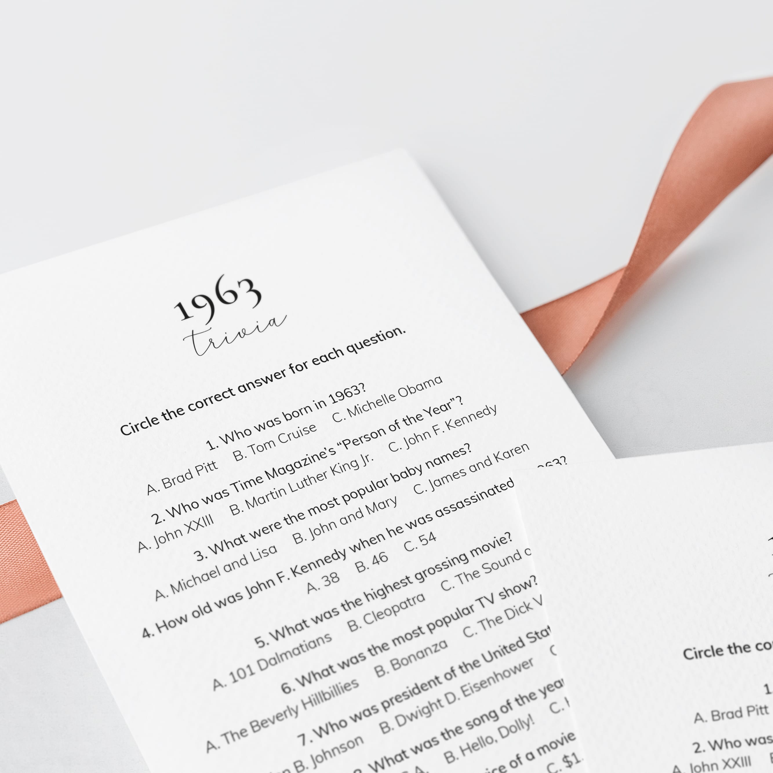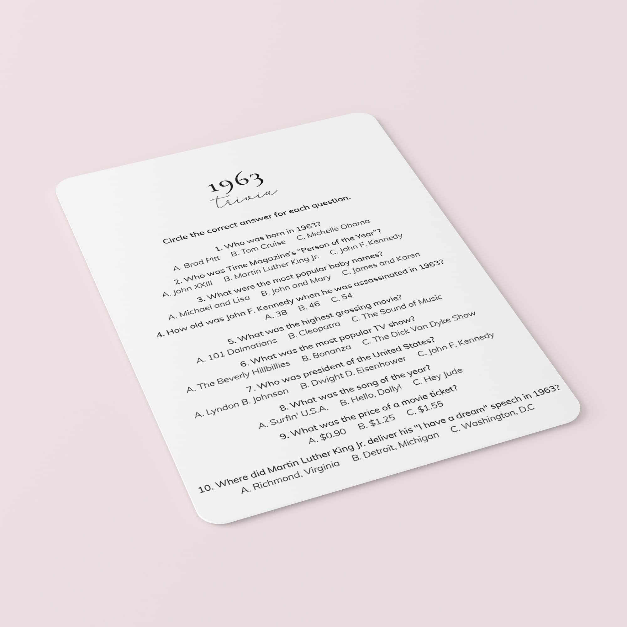 Are you looking for a fun quiz for a 62nd birthday party or 62nd anniversary? Look no further! This 1963 Quiz is such a fun game to play with your friends and family. Test your guests how well they know 1963's pop culture. It's the perfect addition to a birthday bash for someone born in 1963 or to an anniversary party for a couple married in 1963.