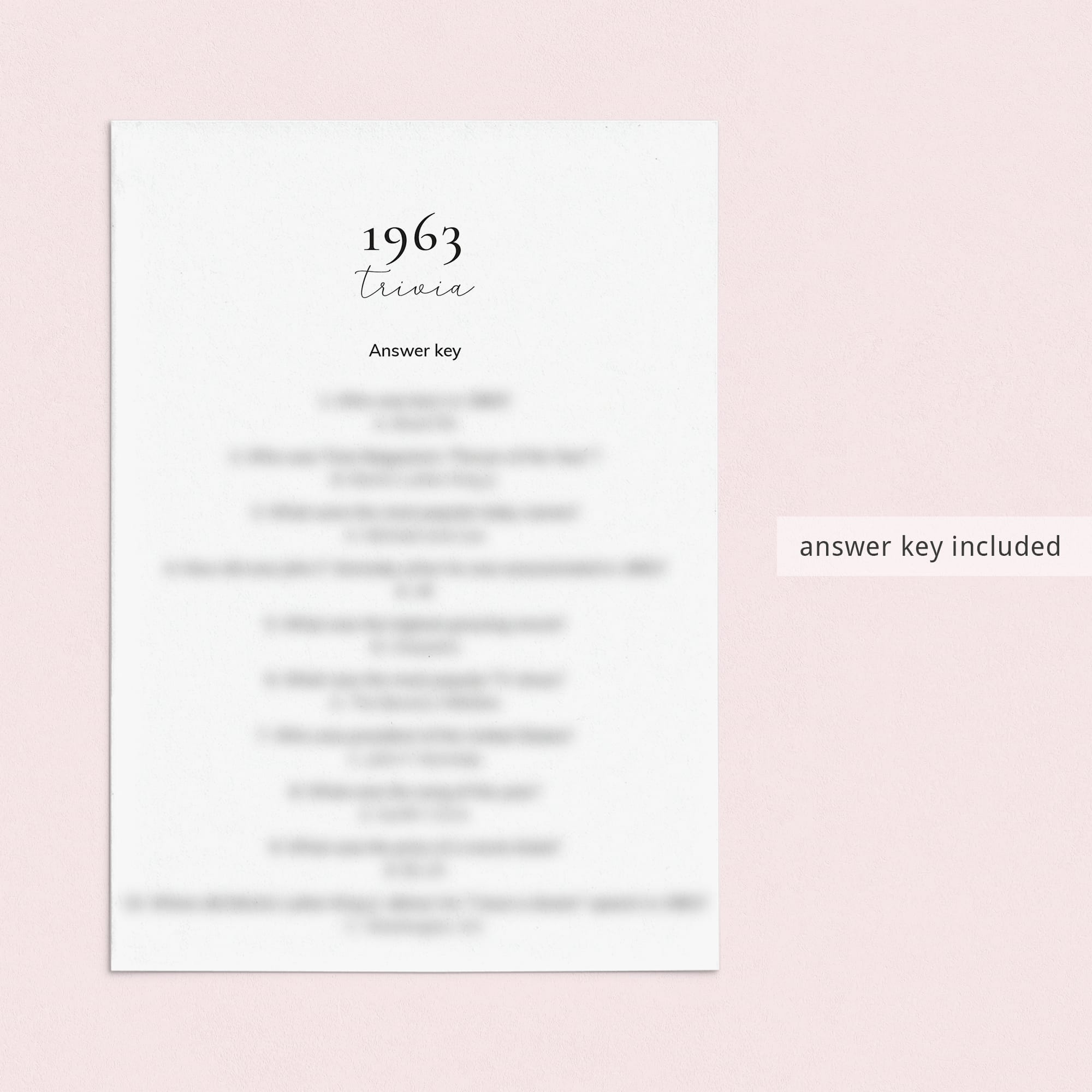 Just in case you are having trouble figuring out the answers, an answer key with the year 1963 quiz answers is included.
