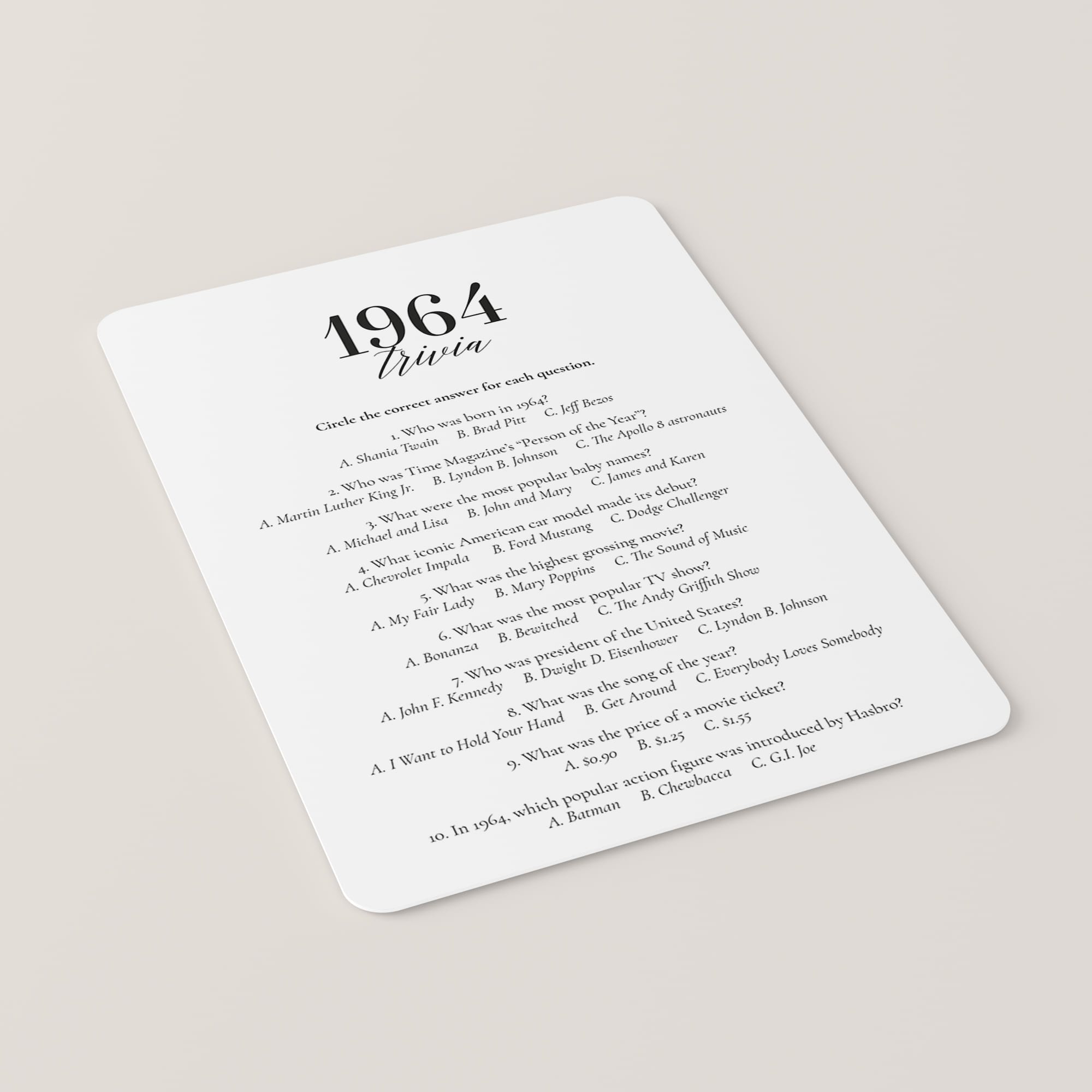 Are you looking for a fun game for a 61st birthday party or 61st anniversary? Look no further! This 1964 fun facts quiz with 10 multiple choice questions is such a fun trivia game to play with your friends and family. Test your guests how well they know 1964's pop culture. It's the perfect addition to a birthday party for someone born in 1964 or to an anniversary party for a couple married in 1964.