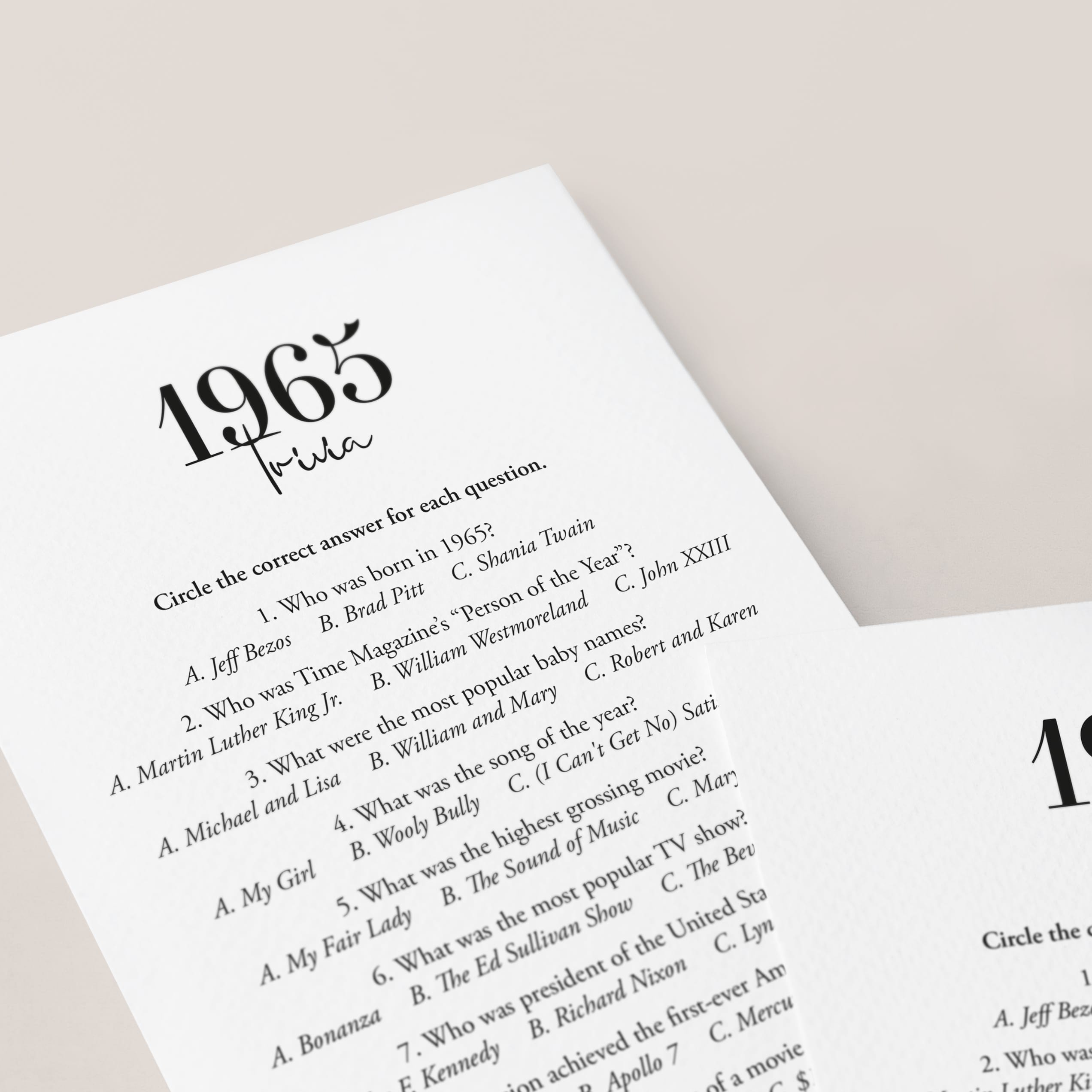 Are you looking for a fun game for a 60th birthday party or 60th anniversary? Look no further! This modern minimalist 1965 trivia with 10 multiple choice questions is such a fun game to play with your friends and family. Test your guests how well they know 1965's pop culture. It's the perfect addition to a birthday party for someone born in 1965 or to an anniversary party for a couple married in 1965.